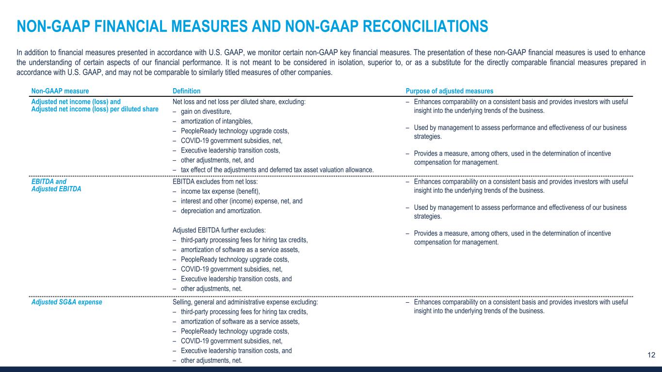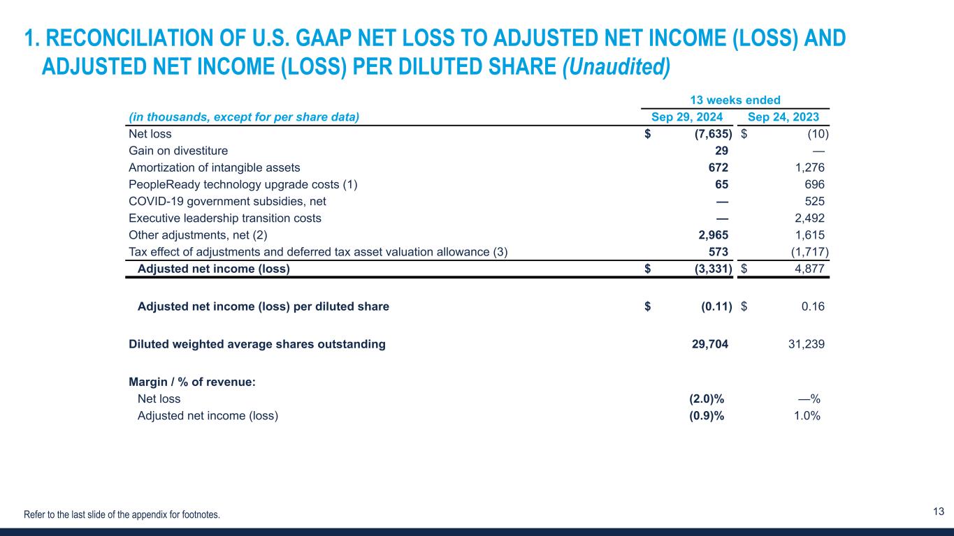 12 NON-GAAP FINANCIAL MEASURES AND NON-GAAP RECONCILIATIONS In addition to financial measures presented in accordance with U.S. GAAP, we monitor certain non-GAAP key financial measures. The presentation of these non-GAAP financial measures is used to enhance the understanding of certain aspects of our financial performance. It is not meant to be considered in isolation, superior to, or as a substitute for the directly comparable financial measures prepared in accordance with U.S. GAAP, and may not be comparable to similarly titled measures of other companies. Non-GAAP measure Definition Purpose of adjusted measures Adjusted net income (loss) and Adjusted net income (loss) per diluted share Net loss and net loss per diluted share, excluding: – gain on divestiture, – amortization of intangibles, – PeopleReady technology upgrade costs, – COVID-19 government subsidies, net, – Executive leadership transition costs, – other adjustments, net, and – tax effect of the adjustments and deferred tax asset valuation allowance. – Enhances comparability on a consistent basis and provides investors with useful insight into the underlying trends of the business. – Used by management to assess performance and effectiveness of our business strategies. – Provides a measure, among others, used in the determination of incentive compensation for management. EBITDA and Adjusted EBITDA EBITDA excludes from net loss: – income tax expense (benefit), – interest and other (income) expense, net, and – depreciation and amortization. Adjusted EBITDA further excludes: – third-party processing fees for hiring tax credits, – amortization of software as a service assets, – PeopleReady technology upgrade costs, – COVID-19 government subsidies, net, – Executive leadership transition costs, and – other adjustments, net. – Enhances comparability on a consistent basis and provides investors with useful insight into the underlying trends of the business. – Used by management to assess performance and effectiveness of our business strategies. – Provides a measure, among others, used in the determination of incentive compensation for management. Adjusted SG&A expense Selling, general and administrative expense excluding: – third-party processing fees for hiring tax credits, – amortization of software as a service assets, – PeopleReady technology upgrade costs, – COVID-19 government subsidies, net, – Executive leadership transition costs, and – other adjustments, net. – Enhances comparability on a consistent basis and provides investors with useful insight into the underlying trends of the business.