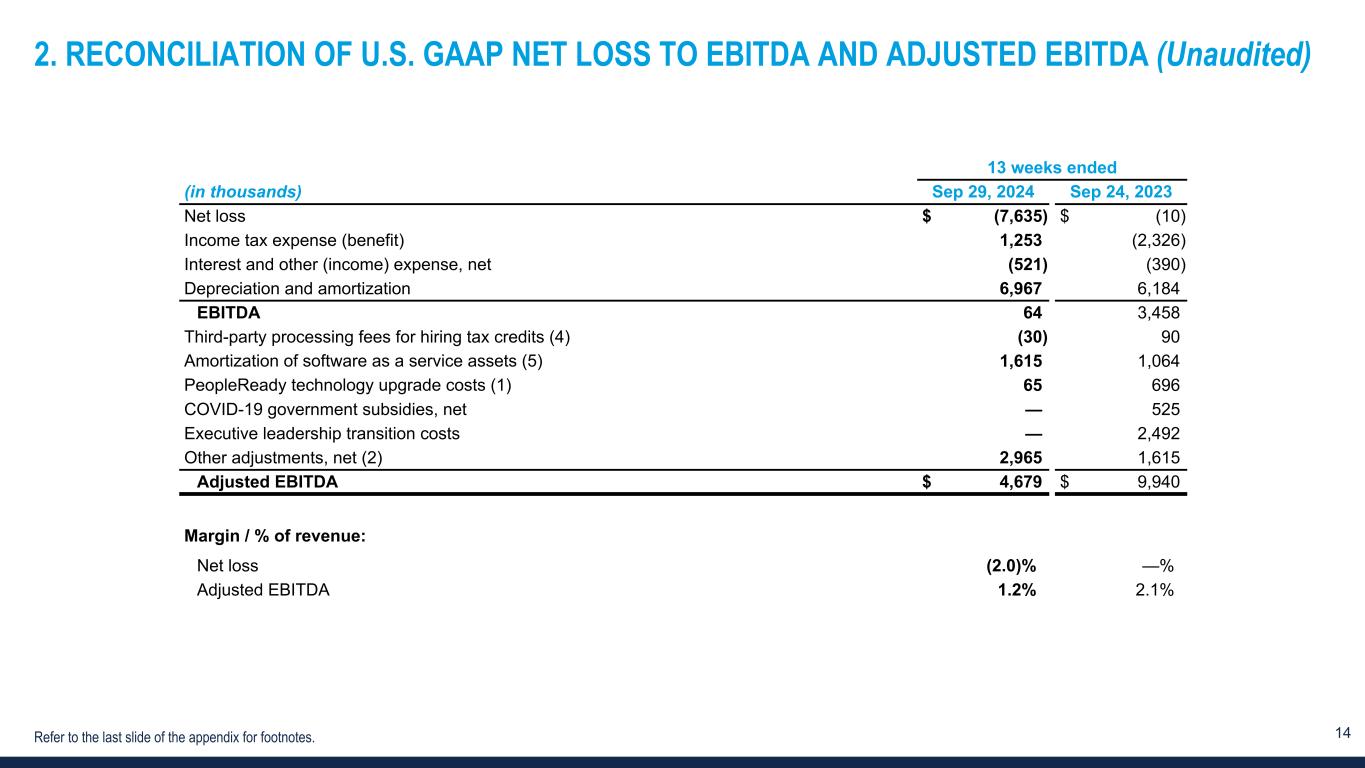13 1. RECONCILIATION OF U.S. GAAP NET LOSS TO ADJUSTED NET INCOME (LOSS) AND ADJUSTED NET INCOME (LOSS) PER DILUTED SHARE (Unaudited) 13 weeks ended (in thousands, except for per share data) Sep 29, 2024 Sep 24, 2023 Net loss $ (7,635) $ (10) Gain on divestiture 29 — Amortization of intangible assets 672 1,276 PeopleReady technology upgrade costs (1) 65 696 COVID-19 government subsidies, net — 525 Executive leadership transition costs — 2,492 Other adjustments, net (2) 2,965 1,615 Tax effect of adjustments and deferred tax asset valuation allowance (3) 573 (1,717) Adjusted net income (loss) $ (3,331) $ 4,877 Adjusted net income (loss) per diluted share $ (0.11) $ 0.16 Diluted weighted average shares outstanding 29,704 31,239 Margin / % of revenue: Net loss (2.0) % — % Adjusted net income (loss) (0.9) % 1.0 % Refer to the last slide of the appendix for footnotes.