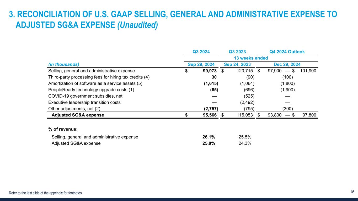 14 2. RECONCILIATION OF U.S. GAAP NET LOSS TO EBITDA AND ADJUSTED EBITDA (Unaudited) Refer to the last slide of the appendix for footnotes. 13 weeks ended (in thousands) Sep 29, 2024 Sep 24, 2023 Net loss $ (7,635) $ (10) Income tax expense (benefit) 1,253 (2,326) Interest and other (income) expense, net (521) (390) Depreciation and amortization 6,967 6,184 EBITDA 64 3,458 Third-party processing fees for hiring tax credits (4) (30) 90 Amortization of software as a service assets (5) 1,615 1,064 PeopleReady technology upgrade costs (1) 65 696 COVID-19 government subsidies, net — 525 Executive leadership transition costs — 2,492 Other adjustments, net (2) 2,965 1,615 Adjusted EBITDA $ 4,679 $ 9,940 Margin / % of revenue: Net loss (2.0) % — % Adjusted EBITDA 1.2 % 2.1 %