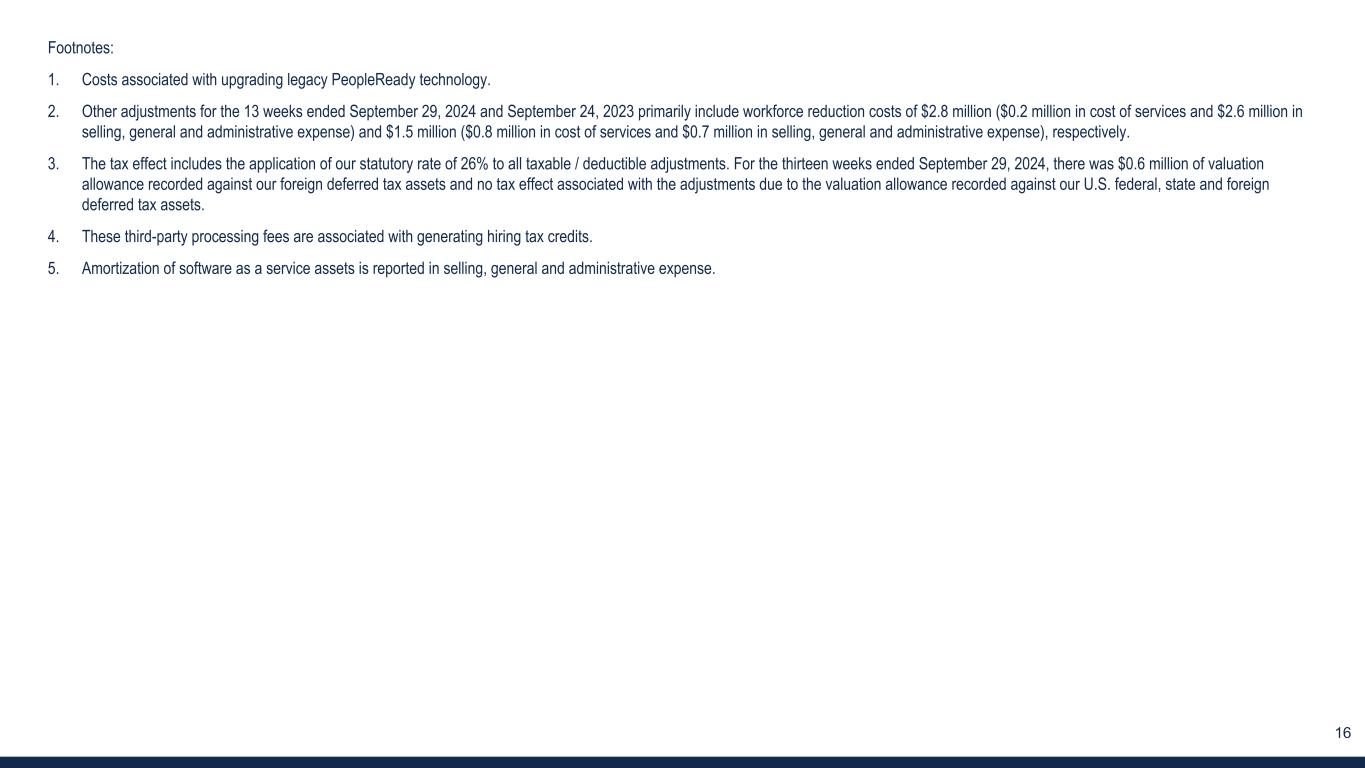 15 3. RECONCILIATION OF U.S. GAAP SELLING, GENERAL AND ADMINISTRATIVE EXPENSE TO ADJUSTED SG&A EXPENSE (Unaudited) Refer to the last slide of the appendix for footnotes. Q3 2024 Q3 2023 Q4 2024 Outlook 13 weeks ended (in thousands) Sep 29, 2024 Sep 24, 2023 Dec 29, 2024 Selling, general and administrative expense $ 99,973 $ 120,715 $ 97,900 — $ 101,900 Third-party processing fees for hiring tax credits (4) 30 (90) (100) Amortization of software as a service assets (5) (1,615) (1,064) (1,800) PeopleReady technology upgrade costs (1) (65) (696) (1,900) COVID-19 government subsidies, net — (525) — Executive leadership transition costs — (2,492) — Other adjustments, net (2) (2,757) (795) (300) Adjusted SG&A expense $ 95,566 $ 115,053 $ 93,800 — $ 97,800 % of revenue: Selling, general and administrative expense 26.1 % 25.5 % Adjusted SG&A expense 25.0 % 24.3 %