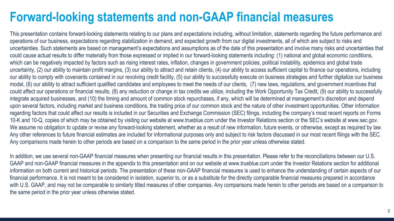 2 Forward-looking statements and non-GAAP financial measures This presentation contains forward-looking statements relating to our plans and expectations including, without limitation, statements regarding the future performance and operations of our business, expectations regarding stabilization in demand, and expected growth from our digital investments, all of which are subject to risks and uncertainties. Such statements are based on management’s expectations and assumptions as of the date of this presentation and involve many risks and uncertainties that could cause actual results to differ materially from those expressed or implied in our forward-looking statements including: (1) national and global economic conditions, which can be negatively impacted by factors such as rising interest rates, inflation, changes in government policies, political instability, epidemics and global trade uncertainty, (2) our ability to maintain profit margins, (3) our ability to attract and retain clients, (4) our ability to access sufficient capital to finance our operations, including our ability to comply with covenants contained in our revolving credit facility, (5) our ability to successfully execute on business strategies and further digitalize our business model, (6) our ability to attract sufficient qualified candidates and employees to meet the needs of our clients, (7) new laws, regulations, and government incentives that could affect our operations or financial results, (8) any reduction or change in tax credits we utilize, including the Work Opportunity Tax Credit, (9) our ability to successfully integrate acquired businesses, and (10) the timing and amount of common stock repurchases, if any, which will be determined at management’s discretion and depend upon several factors, including market and business conditions, the trading price of our common stock and the nature of other investment opportunities. Other information regarding factors that could affect our results is included in our Securities and Exchange Commission (SEC) filings, including the company’s most recent reports on Forms 10-K and 10-Q, copies of which may be obtained by visiting our website at www.trueblue.com under the Investor Relations section or the SEC’s website at www.sec.gov. We assume no obligation to update or revise any forward-looking statement, whether as a result of new information, future events, or otherwise, except as required by law. Any other references to future financial estimates are included for informational purposes only and subject to risk factors discussed in our most recent filings with the SEC. Any comparisons made herein to other periods are based on a comparison to the same period in the prior year unless otherwise stated. In addition, we use several non-GAAP financial measures when presenting our financial results in this presentation. Please refer to the reconciliations between our U.S. GAAP and non-GAAP financial measures in the appendix to this presentation and on our website at www.trueblue.com under the Investor Relations section for additional information on both current and historical periods. The presentation of these non-GAAP financial measures is used to enhance the understanding of certain aspects of our financial performance. It is not meant to be considered in isolation, superior to, or as a substitute for the directly comparable financial measures prepared in accordance with U.S. GAAP, and may not be comparable to similarly titled measures of other companies. Any comparisons made herein to other periods are based on a comparison to the same period in the prior year unless otherwise stated.