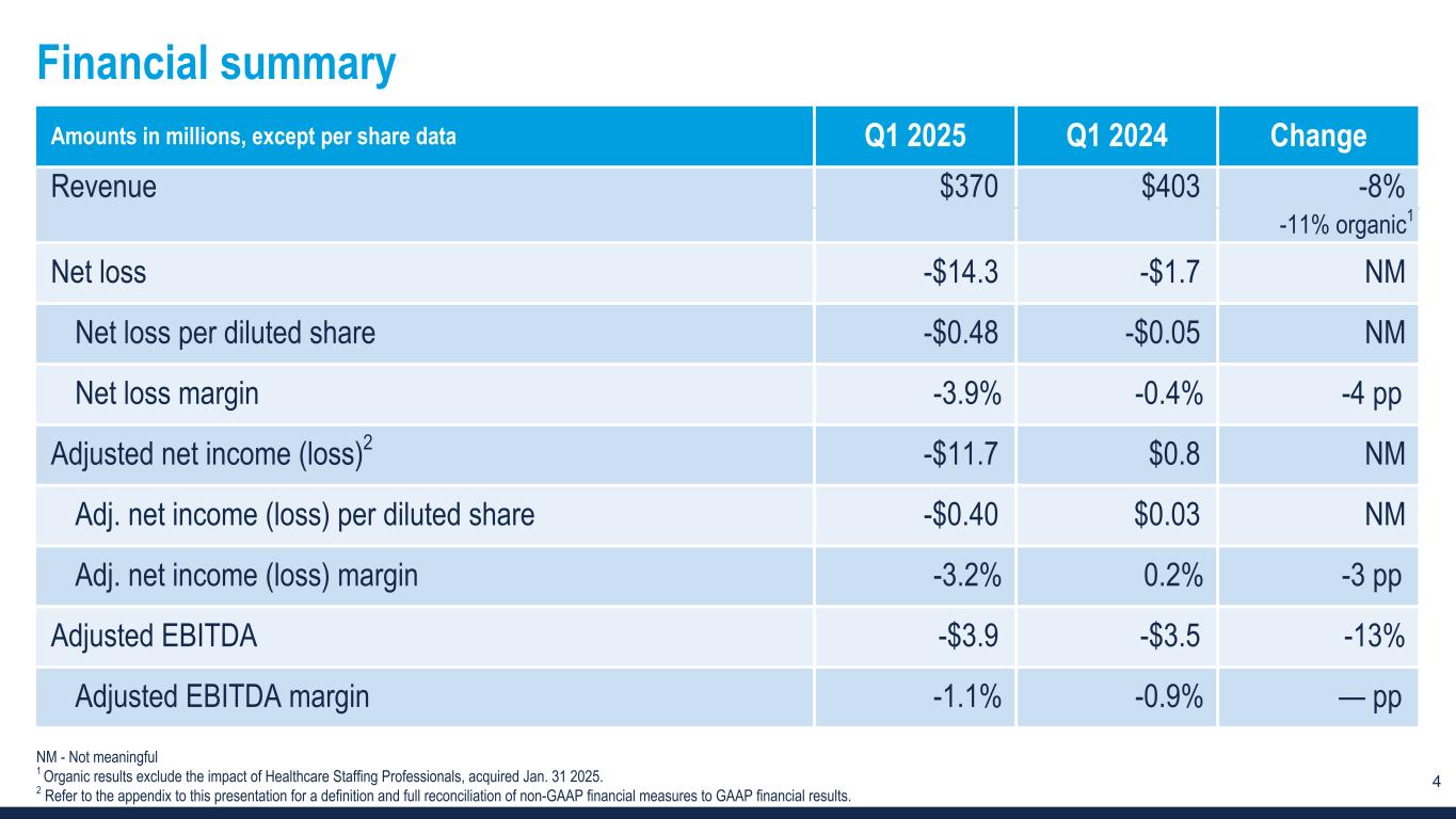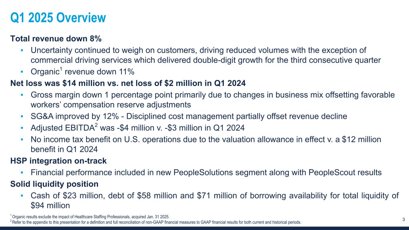 3 Q1 2025 Overview Total revenue down 8% ▪ Uncertainty continued to weigh on customers, driving reduced volumes with the exception of commercial driving services which delivered double-digit growth for the third consecutive quarter ▪ Organic1 revenue down 11% Net loss was $14 million vs. net loss of $2 million in Q1 2024 ▪ Gross margin down 1 percentage point primarily due to changes in business mix offsetting favorable workers’ compensation reserve adjustments ▪ SG&A improved by 12% - Disciplined cost management partially offset revenue decline ▪ Adjusted EBITDA2 was -$4 million v. -$3 million in Q1 2024 ▪ No income tax benefit on U.S. operations due to the valuation allowance in effect v. a $12 million benefit in Q1 2024 HSP integration on-track ▪ Financial performance included in new PeopleSolutions segment along with PeopleScout results Solid liquidity position ▪ Cash of $23 million, debt of $58 million and $71 million of borrowing availability for total liquidity of $94 million 1 Organic results exclude the impact of Healthcare Staffing Professionals, acquired Jan. 31 2025. 2 Refer to the appendix to this presentation for a definition and full reconciliation of non-GAAP financial measures to GAAP financial results for both current and historical periods.