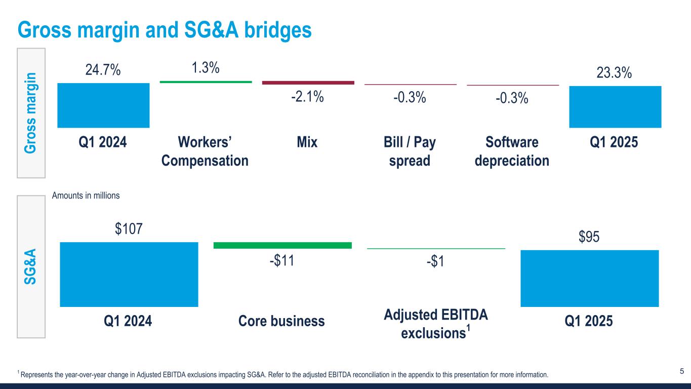 4 Financial summary Amounts in millions, except per share data Q1 2025 Q1 2024 Change Revenue $370 $403 -8 % -11% organic1 Net loss -$14.3 -$1.7 NM Net loss per diluted share -$0.48 -$0.05 NM Net loss margin -3.9 % -0.4 % -4 pp Adjusted net income (loss)2 -$11.7 $0.8 NM Adj. net income (loss) per diluted share -$0.40 $0.03 NM Adj. net income (loss) margin -3.2 % 0.2 % -3 pp Adjusted EBITDA -$3.9 -$3.5 -13 % Adjusted EBITDA margin -1.1 % -0.9 % — pp NM - Not meaningful 1 Organic results exclude the impact of Healthcare Staffing Professionals, acquired Jan. 31 2025. 2 Refer to the appendix to this presentation for a definition and full reconciliation of non-GAAP financial measures to GAAP financial results.