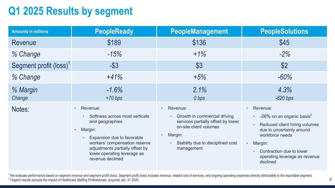 6 Q1 2025 Results by segment Amounts in millions PeopleReady PeopleManagement PeopleSolutions Revenue $189 $136 $45 % Change -15% +1% -2% Segment profit (loss)1 -$3 $3 $2 % Change +41% +5% -60% % Margin -1.6% 2.1% 4.3% Change +70 bps 0 bps -620 bps Notes: ▪ Revenue: • Softness across most verticals and geographies ▪ Margin: ▪ Expansion due to favorable workers’ compensation reserve adjustments partially offset by lower operating leverage as revenue declined ▪ Revenue: • Growth in commercial driving services partially offset by lower on-site client volumes ▪ Margin: ▪ Stability due to disciplined cost management ▪ Revenue: • -26% on an organic basis2 • Reduced client hiring volumes due to uncertainty around workforce needs ▪ Margin: ▪ Contraction due to lower operating leverage as revenue declined 1 We evaluate performance based on segment revenue and segment profit (loss). Segment profit (loss) includes revenue, related cost of services, and ongoing operating expenses directly attributable to the reportable segment. 2 Organic results exclude the impact of Healthcare Staffing Professionals, acquired Jan. 31 2025.
