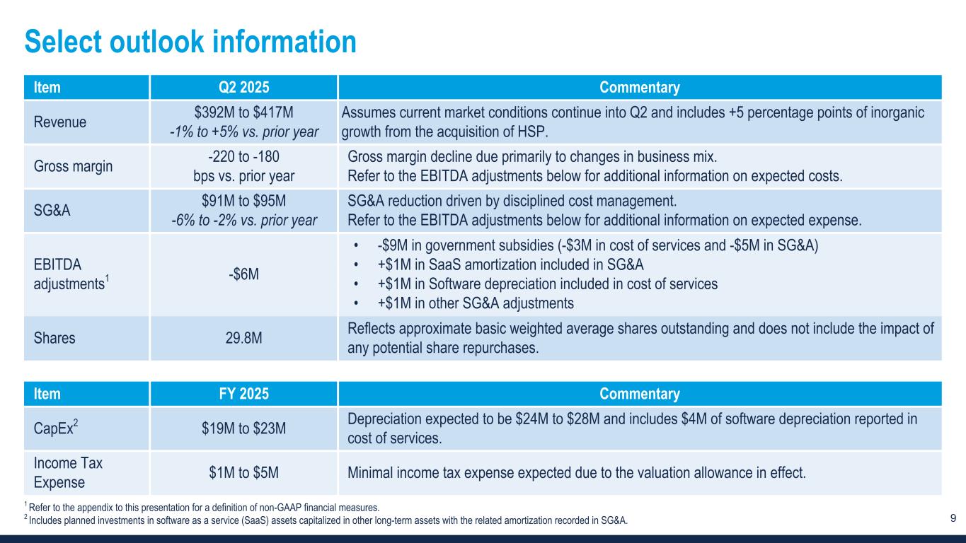 9 Select outlook information Item Q2 2025 Commentary Revenue $392M to $417M -1% to +5% vs. prior year Assumes current market conditions continue into Q2 and includes +5 percentage points of inorganic growth from the acquisition of HSP. Gross margin -220 to -180 bps vs. prior year Gross margin decline due primarily to changes in business mix. Refer to the EBITDA adjustments below for additional information on expected costs. SG&A $91M to $95M -6% to -2% vs. prior year SG&A reduction driven by disciplined cost management. Refer to the EBITDA adjustments below for additional information on expected expense. EBITDA adjustments1 -$6M • -$9M in government subsidies (-$3M in cost of services and -$5M in SG&A) • +$1M in SaaS amortization included in SG&A • +$1M in Software depreciation included in cost of services • +$1M in other SG&A adjustments Shares 29.8M Reflects approximate basic weighted average shares outstanding and does not include the impact of any potential share repurchases. Item FY 2025 Commentary CapEx2 $19M to $23M Depreciation expected to be $24M to $28M and includes $4M of software depreciation reported in cost of services. Income Tax Expense $1M to $5M Minimal income tax expense expected due to the valuation allowance in effect. 1 Refer to the appendix to this presentation for a definition of non-GAAP financial measures. 2 Includes planned investments in software as a service (SaaS) assets capitalized in other long-term assets with the related amortization recorded in SG&A.