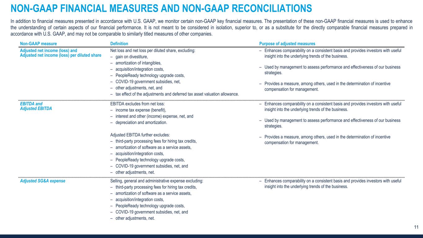 11 NON-GAAP FINANCIAL MEASURES AND NON-GAAP RECONCILIATIONS In addition to financial measures presented in accordance with U.S. GAAP, we monitor certain non-GAAP key financial measures. The presentation of these non-GAAP financial measures is used to enhance the understanding of certain aspects of our financial performance. It is not meant to be considered in isolation, superior to, or as a substitute for the directly comparable financial measures prepared in accordance with U.S. GAAP, and may not be comparable to similarly titled measures of other companies. Non-GAAP measure Definition Purpose of adjusted measures Adjusted net income (loss) and Adjusted net income (loss) per diluted share Net loss and net loss per diluted share, excluding: – gain on divestiture, – amortization of intangibles, – acquisition/integration costs, – PeopleReady technology upgrade costs, – COVID-19 government subsidies, net, – other adjustments, net, and – tax effect of the adjustments and deferred tax asset valuation allowance. – Enhances comparability on a consistent basis and provides investors with useful insight into the underlying trends of the business. – Used by management to assess performance and effectiveness of our business strategies. – Provides a measure, among others, used in the determination of incentive compensation for management. EBITDA and Adjusted EBITDA EBITDA excludes from net loss: – income tax expense (benefit), – interest and other (income) expense, net, and – depreciation and amortization. Adjusted EBITDA further excludes: – third-party processing fees for hiring tax credits, – amortization of software as a service assets, – acquisition/integration costs, – PeopleReady technology upgrade costs, – COVID-19 government subsidies, net, and – other adjustments, net. – Enhances comparability on a consistent basis and provides investors with useful insight into the underlying trends of the business. – Used by management to assess performance and effectiveness of our business strategies. – Provides a measure, among others, used in the determination of incentive compensation for management. Adjusted SG&A expense Selling, general and administrative expense excluding: – third-party processing fees for hiring tax credits, – amortization of software as a service assets, – acquisition/integration costs, – PeopleReady technology upgrade costs, – COVID-19 government subsidies, net, and – other adjustments, net. – Enhances comparability on a consistent basis and provides investors with useful insight into the underlying trends of the business.