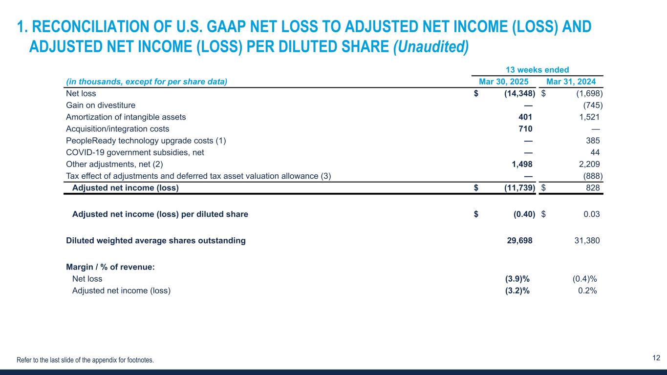 12 1. RECONCILIATION OF U.S. GAAP NET LOSS TO ADJUSTED NET INCOME (LOSS) AND ADJUSTED NET INCOME (LOSS) PER DILUTED SHARE (Unaudited) 13 weeks ended (in thousands, except for per share data) Mar 30, 2025 Mar 31, 2024 Net loss $ (14,348) $ (1,698) Gain on divestiture — (745) Amortization of intangible assets 401 1,521 Acquisition/integration costs 710 — PeopleReady technology upgrade costs (1) — 385 COVID-19 government subsidies, net — 44 Other adjustments, net (2) 1,498 2,209 Tax effect of adjustments and deferred tax asset valuation allowance (3) — (888) Adjusted net income (loss) $ (11,739) $ 828 Adjusted net income (loss) per diluted share $ (0.40) $ 0.03 Diluted weighted average shares outstanding 29,698 31,380 Margin / % of revenue: Net loss (3.9) % (0.4) % Adjusted net income (loss) (3.2) % 0.2 % Refer to the last slide of the appendix for footnotes.