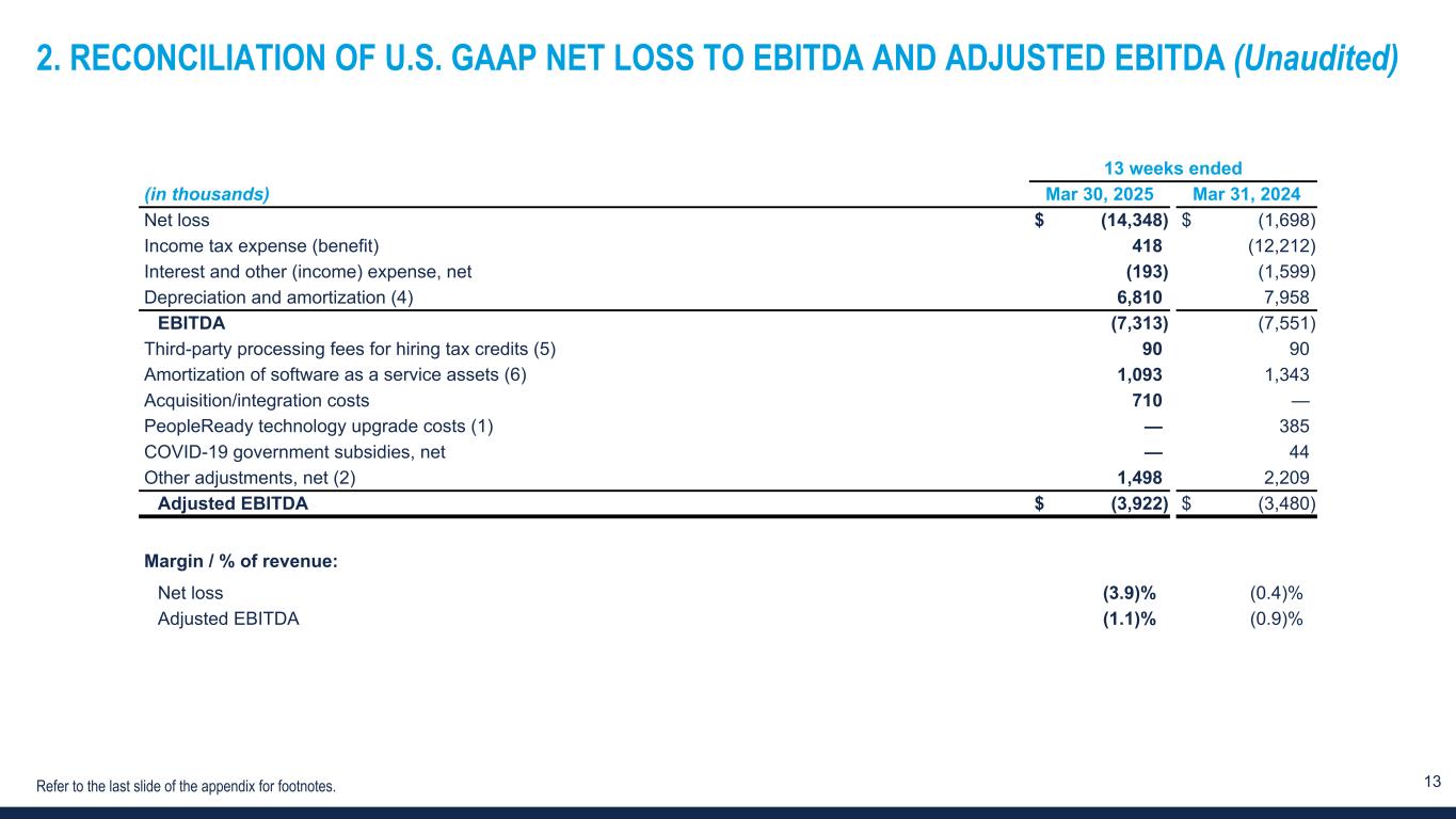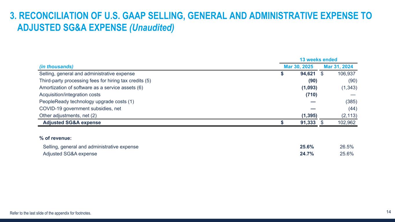 13 2. RECONCILIATION OF U.S. GAAP NET LOSS TO EBITDA AND ADJUSTED EBITDA (Unaudited) Refer to the last slide of the appendix for footnotes. 13 weeks ended (in thousands) Mar 30, 2025 Mar 31, 2024 Net loss $ (14,348) $ (1,698) Income tax expense (benefit) 418 (12,212) Interest and other (income) expense, net (193) (1,599) Depreciation and amortization (4) 6,810 7,958 EBITDA (7,313) (7,551) Third-party processing fees for hiring tax credits (5) 90 90 Amortization of software as a service assets (6) 1,093 1,343 Acquisition/integration costs 710 — PeopleReady technology upgrade costs (1) — 385 COVID-19 government subsidies, net — 44 Other adjustments, net (2) 1,498 2,209 Adjusted EBITDA $ (3,922) $ (3,480) Margin / % of revenue: Net loss (3.9) % (0.4) % Adjusted EBITDA (1.1) % (0.9) %