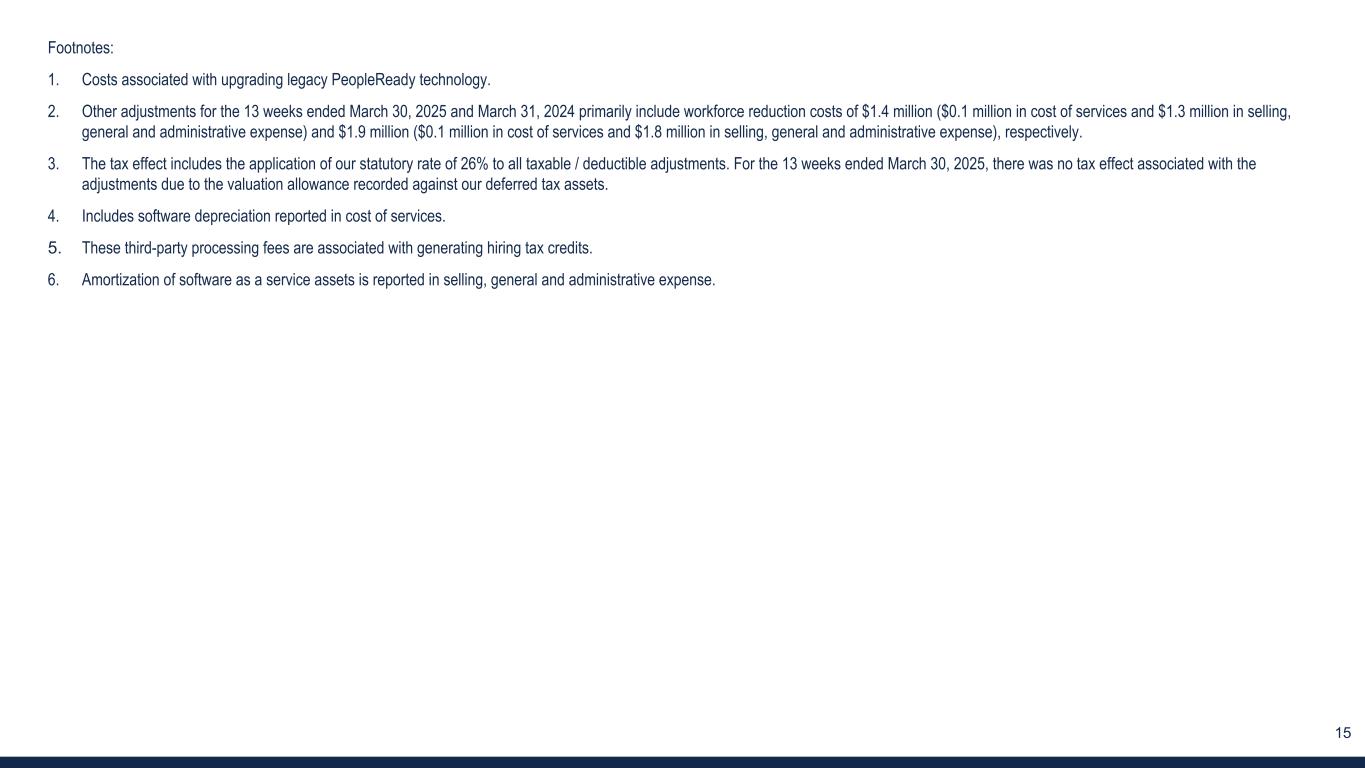 14 3. RECONCILIATION OF U.S. GAAP SELLING, GENERAL AND ADMINISTRATIVE EXPENSE TO ADJUSTED SG&A EXPENSE (Unaudited) Refer to the last slide of the appendix for footnotes. 13 weeks ended (in thousands) Mar 30, 2025 Mar 31, 2024 Selling, general and administrative expense $ 94,621 $ 106,937 Third-party processing fees for hiring tax credits (5) (90) (90) Amortization of software as a service assets (6) (1,093) (1,343) Acquisition/integration costs (710) — PeopleReady technology upgrade costs (1) — (385) COVID-19 government subsidies, net — (44) Other adjustments, net (2) (1,395) (2,113) Adjusted SG&A expense $ 91,333 $ 102,962 % of revenue: Selling, general and administrative expense 25.6 % 26.5 % Adjusted SG&A expense 24.7 % 25.6 %