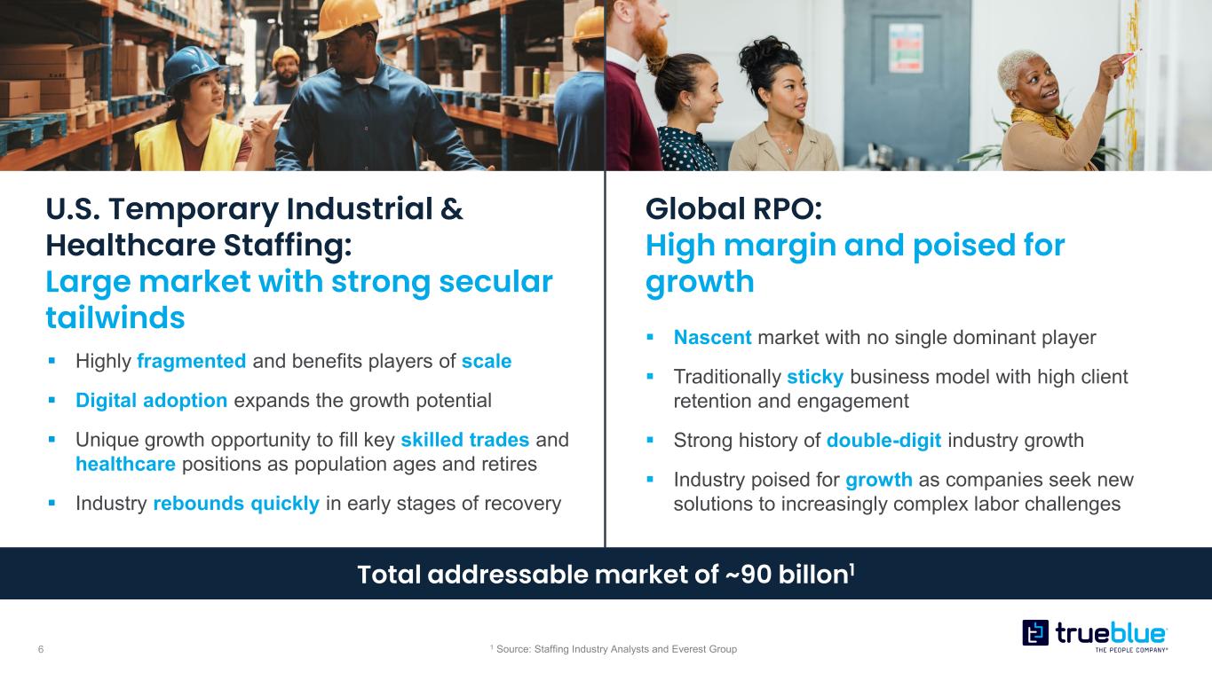 5 Solving workforce challenges Companies turn to human capital experts with innovative workforce solutions to solve growing talent challenges A robust value proposition with high-touch, specialized, digitally enabled solutions for staffing and recruitment process outsourcing. Workforce Complexity Many factors, including globalization and the “gig” economy are changing the world of work requiring a disciplined approach to hiring. Artificial Intelligence Companies are seeking ways to become more nimble and efficient Deploying AI to source human capital will be a competitive differentiator. Digital Engagement The worker supply chain is becoming increasingly decentralized. TrueBlue’s digital strategy connects people anywhere at any time.