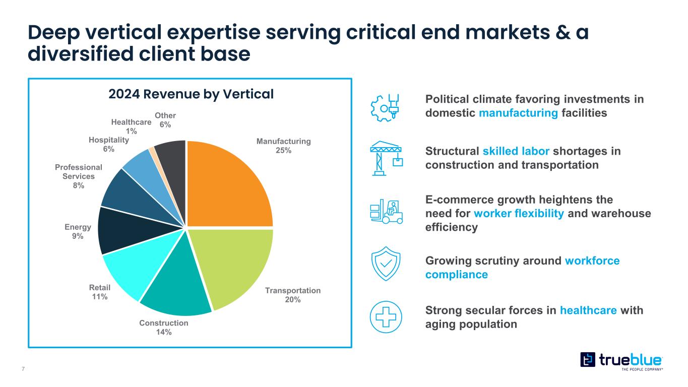 6 Total addressable market of ~90 billon1 U.S. Temporary Industrial & Healthcare Staffing: Large market with strong secular tailwinds Global RPO: High margin and poised for growth  Highly fragmented and benefits players of scale  Digital adoption expands the growth potential  Unique growth opportunity to fill key skilled trades and healthcare positions as population ages and retires  Industry rebounds quickly in early stages of recovery  Nascent market with no single dominant player  Traditionally sticky business model with high client retention and engagement  Strong history of double-digit industry growth  Industry poised for growth as companies seek new solutions to increasingly complex labor challenges 1 Source: Staffing Industry Analysts and Everest Group