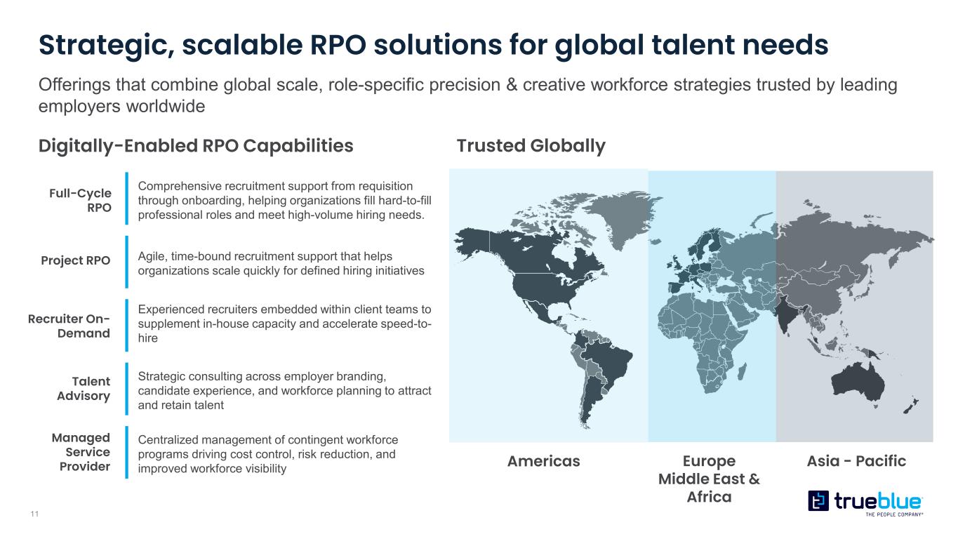 10 Omnichannel Workforce Delivery—connecting employers and talent across the U.S. Layered for coverage and built for growth — meeting employers and talent wherever they are and wherever they are going Localized staffing support through ~500 branches nationwide, connecting businesses with talent in their communities. Branch-Based Embedded teams manage high-volume staffing directly at client locations, delivering operational efficiency and workforce continuity. Embedded On-site Mobile teams deployed to support construction sites, facility ramp-ups, retail setups, and field-based operations across the U.S. Project & Field-Based App-powered, self-serve access to talent—enabling real-time hiring and flexible workforce management anytime, anywhere. Mobile Talent Management *Maps are illustrative Driving differentiated value for employers Delivering access, choice and opportunity to talent  Specialized workforce solutions across contingent, skilled, and professional  Compliance focused operations to reduce risk and drive continuity at scale  Proprietary technology accelerates hiring and improves access to talent  Broad access to roles across industries, regions, and experience levels  Mobile platform gives talent control over when, where, and how they work  Upskilling and assessments unlock growth and support long-term retention