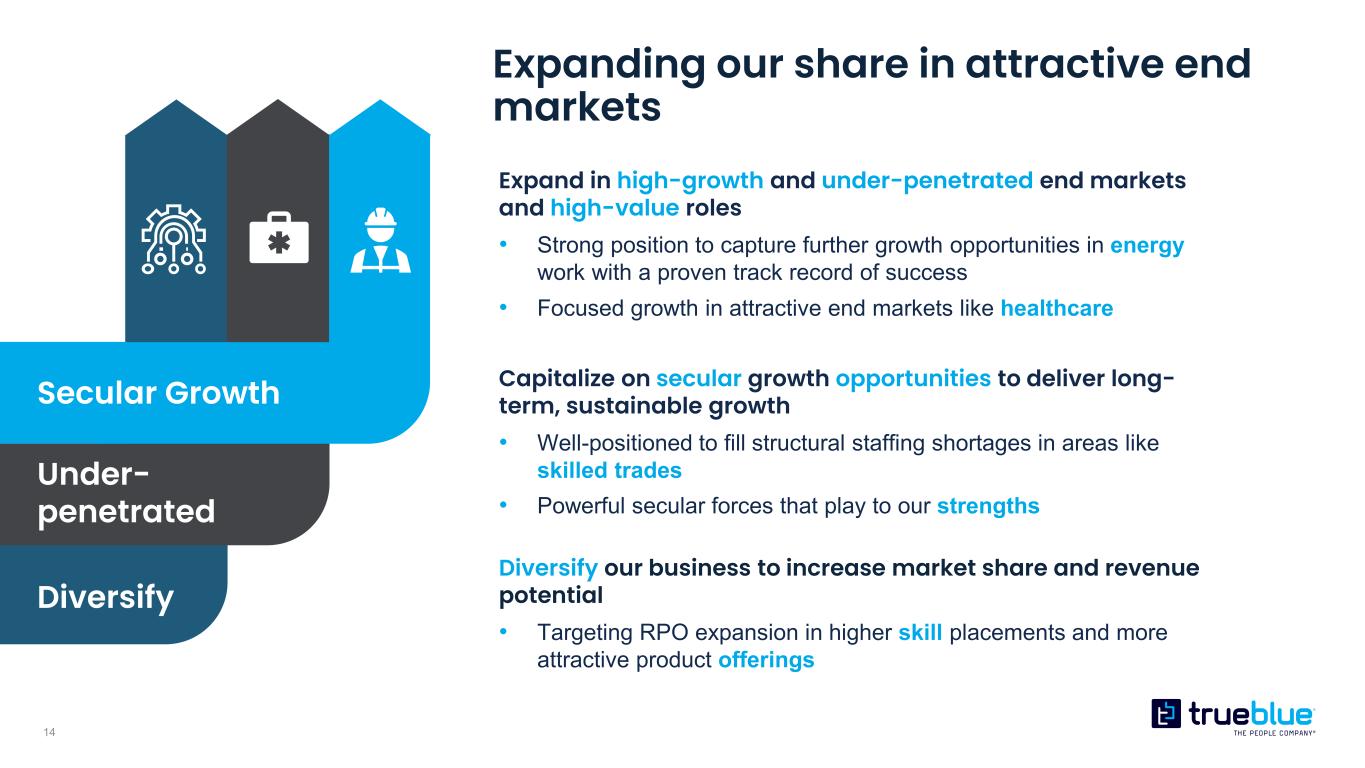 13 Accelerating digital transformation across the enterprise Drive competitive advantage through proprietary innovation • Extend the reach of digitally enabled staffing and recruitment solutions to support scalable growth, cost efficiency and margin expansion Enhance client and talent engagement through data and automation • Expand value-added platform capabilities to elevate user experience, deepen engagement, and enhance profitability • Apply AI and behavioral data to deliver smarter, more personalized solutions that strengthen client and talent loyalty Unlock enterprise efficiency at scale • Advance modular deployment, automation, and analytics to improve decision velocity and enterprise-wide resource utilization