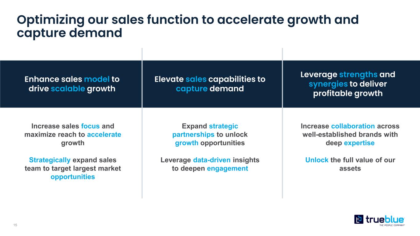 14 Expanding our share in attractive end markets Expand in high-growth and under-penetrated end markets and high-value roles • Strong position to capture further growth opportunities in energy work with a proven track record of success • Focused growth in attractive end markets like healthcare Capitalize on secular growth opportunities to deliver long- term, sustainable growth • Well-positioned to fill structural staffing shortages in areas like skilled trades • Powerful secular forces that play to our strengths Diversify our business to increase market share and revenue potential • Targeting RPO expansion in higher skill placements and more attractive product offerings Secular Growth Under- penetrated Diversify