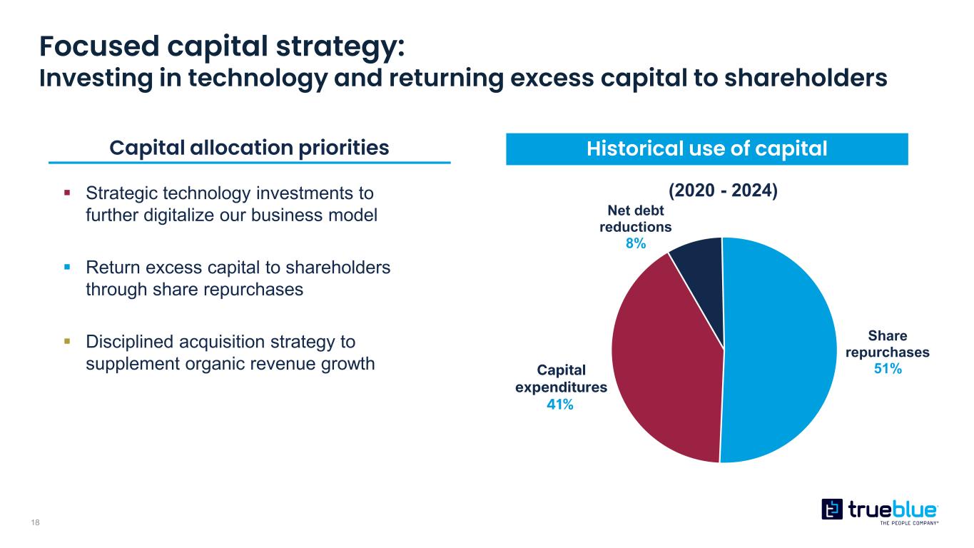 17 Strong balance sheet with ample liquidity $0 $0 $0 -$8 $294 $293 $86 $119 $50 $72 $62 $22 2021 2022 2023 2024 Debt Borrowing availability Cash *Amounts in millions 1 $17 $61 $34 $21 2% 6% 5% 4% -20% -15% -10% -5% 0% 5% 10% 0 10 20 30 40 50 60 70 80 90 100 2021 2022 2023 2024 Share Repurchases Buyback ratio2 Note: Figures may not sum to consolidated totals due to rounding. Balances as of fiscal period end. 1 Borrowing availability is based on maximum borrowing availability under our most restrictive covenant. 2 Buyback ratio calculated as the dollar value of share repurchases during the period divided by our market capitalization at the beginning of the fiscal period.
