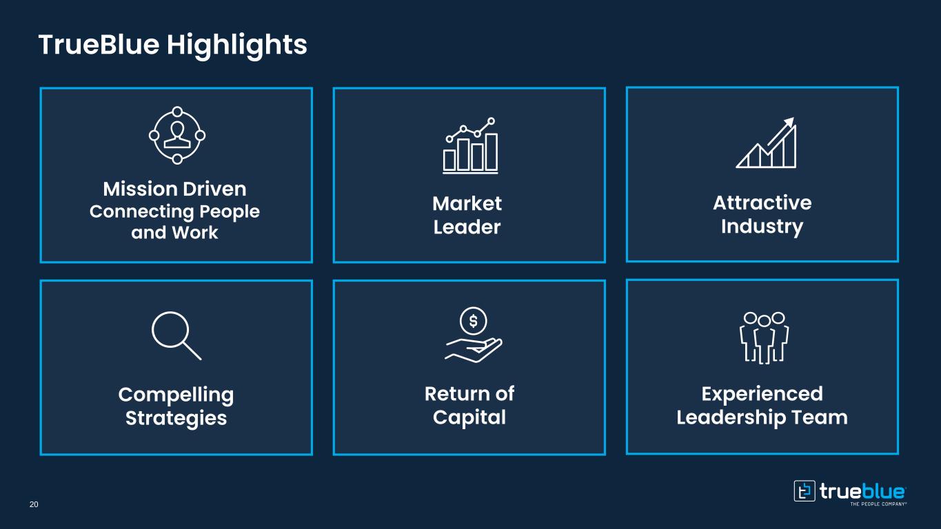 Leadership with deep expertise Taryn Owen President and Chief Executive Officer Carl Schweihs EVP and Chief Financial Officer Kristy Willis EVP and President, PeopleReady Rick Betori EVP and President, PeopleSolutions Jerry Wimer SVP and President, PeopleManagement Garrett Ferencz EVP and Chief Legal Officer Jeff Dirks SVP and Chief Digital Officer Greg Netolicky SVP and Chief People Officer Caroline Sabetti SVP and Chief Marketing and Communications Officer Maxie Juzang SVP and President, Healthcare Staffing Professionals 19