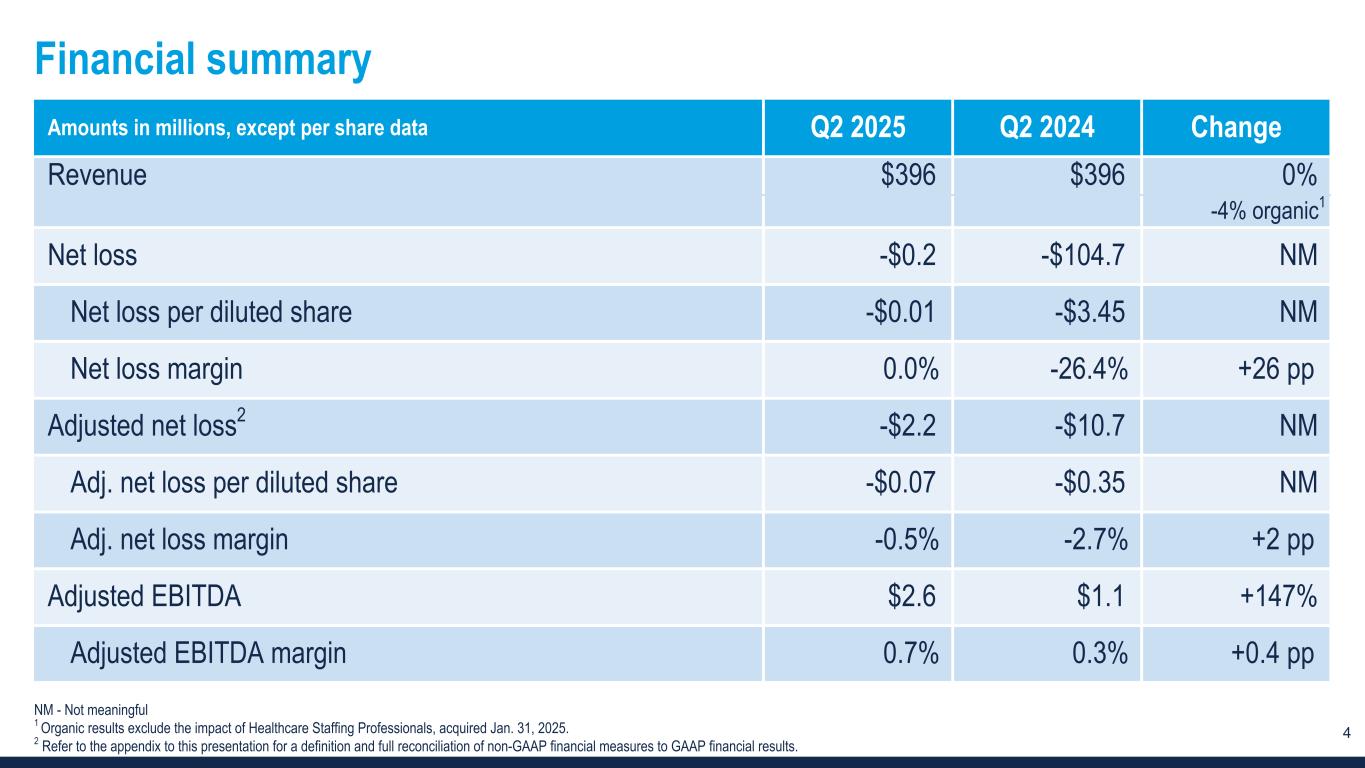 3 Q2 2025 Overview Total revenue was $396 million and flat to prior year ▪ Organic1 revenue down 4% ▪ Uncertainty and caution continued to weigh on customers, driving reduced volumes with the exception of our skilled businesses which delivered double-digit growth for the quarter Net loss was $0 million vs. net loss of $105 million in Q2 2024 ▪ Prior year included $100 million in non-cash impairment and tax valuation charges ▪ Gross margin was down 3 percentage points primarily due to changes in business mix ▪ SG&A improved 7% driven by disciplined cost management ▪ Adjusted EBITDA2 was $3 million v. $1 million in Q2 2024 HSP integration on-track ▪ Financial performance included in PeopleSolutions segment along with PeopleScout results Solid liquidity position ▪ Cash of $22 million, debt of $54 million and $79 million of borrowing availability for total liquidity of $101 million ▪ Reduced debt by $4 million and increased working capital by $14 million 1 Organic results exclude the impact of Healthcare Staffing Professionals, acquired Jan. 31, 2025. 2 Refer to the appendix to this presentation for a definition and full reconciliation of non-GAAP financial measures to GAAP financial results for both current and historical periods.