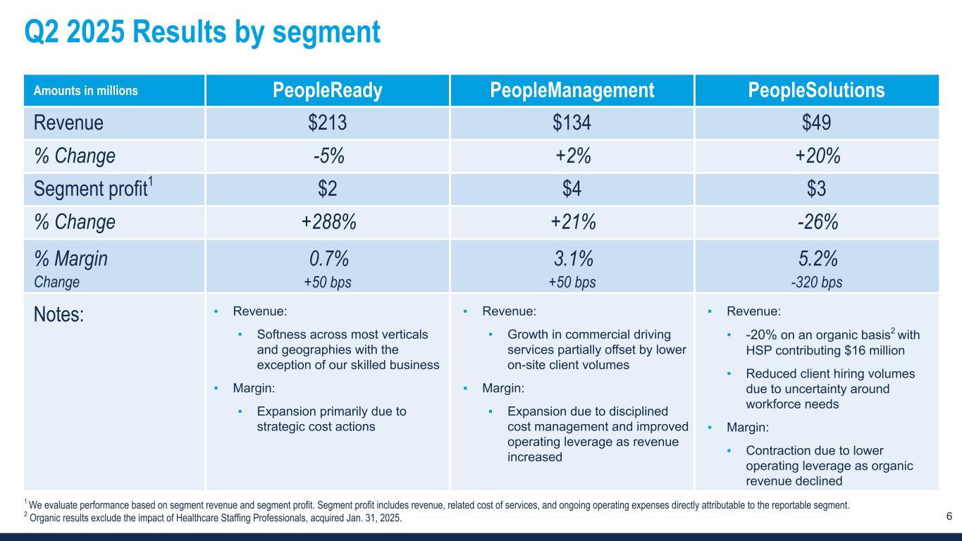 15 Footnotes: 1. Workforce reduction costs of $3.4 million for the 13 weeks ended June 29, 2025 were reported as $0.1 million in cost of services and $3.3 million in selling, general and administrative expense. Workforce reduction costs of $1.5 million for the 13 weeks ended June 30, 2024 were reported as $0.2 million in cost of services and $1.3 million in selling, general and administrative expense. 2. Costs associated with upgrading legacy PeopleReady technology. 3. COVID-19 government subsidies net of related fees. $3.2 million reported in cost of services and $5.4 million in selling, general and administrative expense for the 13 weeks ended June 29, 2025. For the 13 weeks ended June 30, 2024, $2.9 million reported in cost of services and $6.8 million in selling, general and administrative. 4. Other adjustments for the 13 weeks ended June 29, 2025 include non-routine professional fees and other expenses. 5. The tax effect includes the application of our statutory rate of 26% to all taxable / deductible adjustments. For the 13 weeks ended June 30, 2024, the tax effect also included a valuation allowance of $55 million recorded against our deferred tax assets. For the 13 weeks ended June 29, 2025, there was no tax effect associated with the adjustments due to the valuation allowance recorded against our deferred tax assets. 6. Includes software depreciation reported in cost of services. 7. These third-party processing fees are associated with generating hiring tax credits. 8. Amortization of software as a service assets is reported in selling, general and administrative expense.