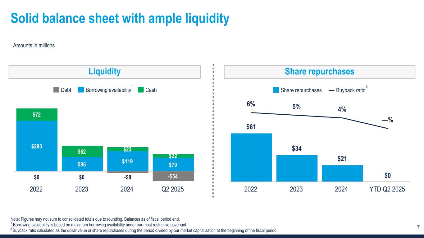 7 Solid balance sheet with ample liquidity $0 $0 -$8 -$54 $293 $86 $119 $79 $72 $62 $23 $22 Debt Borrowing availability Cash 2022 2023 2024 Q2 2025 Amounts in millions Note: Figures may not sum to consolidated totals due to rounding. Balances as of fiscal period end. 1 Borrowing availability is based on maximum borrowing availability under our most restrictive covenant. 2 Buyback ratio calculated as the dollar value of share repurchases during the period divided by our market capitalization at the beginning of the fiscal period. Liquidity Share repurchases 1 $61 $34 $21 $0 6% 5% 4% —% Share repurchases Buyback ratio 2022 2023 2024 YTD Q2 2025 2
