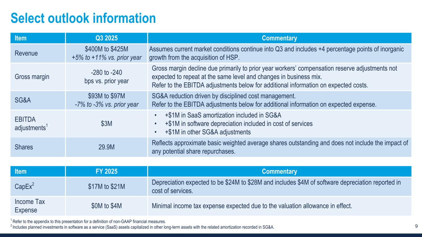 9 Select outlook information Item Q3 2025 Commentary Revenue $400M to $425M +5% to +11% vs. prior year Assumes current market conditions continue into Q3 and includes +4 percentage points of inorganic growth from the acquisition of HSP. Gross margin -280 to -240 bps vs. prior year Gross margin decline due primarily to prior year workers’ compensation reserve adjustments not expected to repeat at the same level and changes in business mix. Refer to the EBITDA adjustments below for additional information on expected costs. SG&A $93M to $97M -7% to -3% vs. prior year SG&A reduction driven by disciplined cost management. Refer to the EBITDA adjustments below for additional information on expected expense. EBITDA adjustments1 $3M • +$1M in SaaS amortization included in SG&A • +$1M in software depreciation included in cost of services • +$1M in other SG&A adjustments Shares 29.9M Reflects approximate basic weighted average shares outstanding and does not include the impact of any potential share repurchases. Item FY 2025 Commentary CapEx2 $17M to $21M Depreciation expected to be $24M to $28M and includes $4M of software depreciation reported in cost of services. Income Tax Expense $0M to $4M Minimal income tax expense expected due to the valuation allowance in effect. 1 Refer to the appendix to this presentation for a definition of non-GAAP financial measures. 2 Includes planned investments in software as a service (SaaS) assets capitalized in other long-term assets with the related amortization recorded in SG&A.