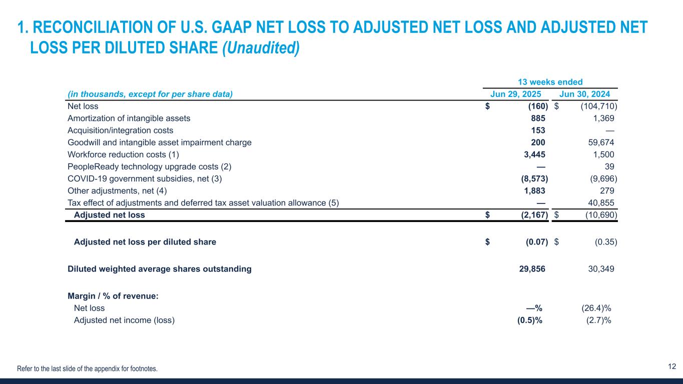 12 1. RECONCILIATION OF U.S. GAAP NET LOSS TO ADJUSTED NET LOSS AND ADJUSTED NET LOSS PER DILUTED SHARE (Unaudited) 13 weeks ended (in thousands, except for per share data) Jun 29, 2025 Jun 30, 2024 Net loss $ (160) $ (104,710) Amortization of intangible assets 885 1,369 Acquisition/integration costs 153 — Goodwill and intangible asset impairment charge 200 59,674 Workforce reduction costs (1) 3,445 1,500 PeopleReady technology upgrade costs (2) — 39 COVID-19 government subsidies, net (3) (8,573) (9,696) Other adjustments, net (4) 1,883 279 Tax effect of adjustments and deferred tax asset valuation allowance (5) — 40,855 Adjusted net loss $ (2,167) $ (10,690) Adjusted net loss per diluted share $ (0.07) $ (0.35) Diluted weighted average shares outstanding 29,856 30,349 Margin / % of revenue: Net loss — % (26.4) % Adjusted net income (loss) (0.5) % (2.7) % Refer to the last slide of the appendix for footnotes.