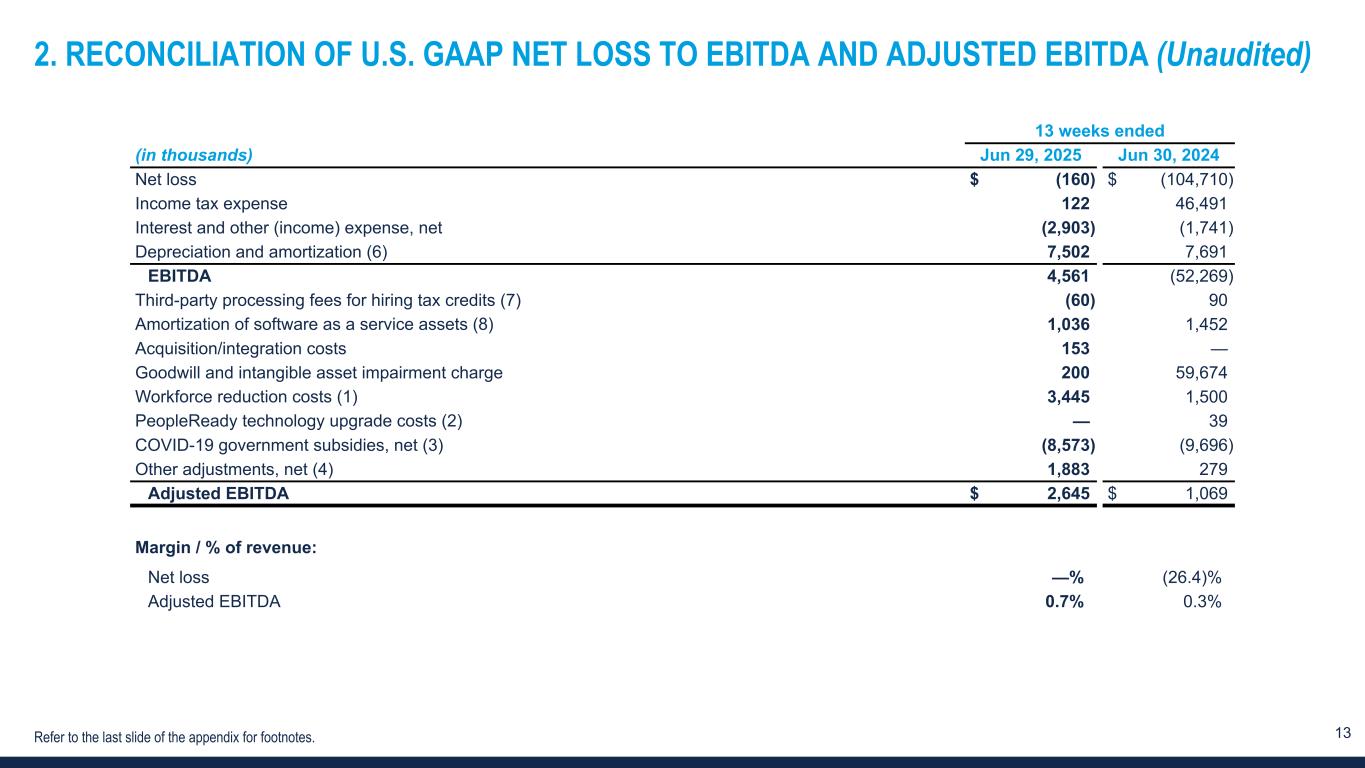 13 2. RECONCILIATION OF U.S. GAAP NET LOSS TO EBITDA AND ADJUSTED EBITDA (Unaudited) Refer to the last slide of the appendix for footnotes. 13 weeks ended (in thousands) Jun 29, 2025 Jun 30, 2024 Net loss $ (160) $ (104,710) Income tax expense 122 46,491 Interest and other (income) expense, net (2,903) (1,741) Depreciation and amortization (6) 7,502 7,691 EBITDA 4,561 (52,269) Third-party processing fees for hiring tax credits (7) (60) 90 Amortization of software as a service assets (8) 1,036 1,452 Acquisition/integration costs 153 — Goodwill and intangible asset impairment charge 200 59,674 Workforce reduction costs (1) 3,445 1,500 PeopleReady technology upgrade costs (2) — 39 COVID-19 government subsidies, net (3) (8,573) (9,696) Other adjustments, net (4) 1,883 279 Adjusted EBITDA $ 2,645 $ 1,069 Margin / % of revenue: Net loss — % (26.4) % Adjusted EBITDA 0.7 % 0.3 %