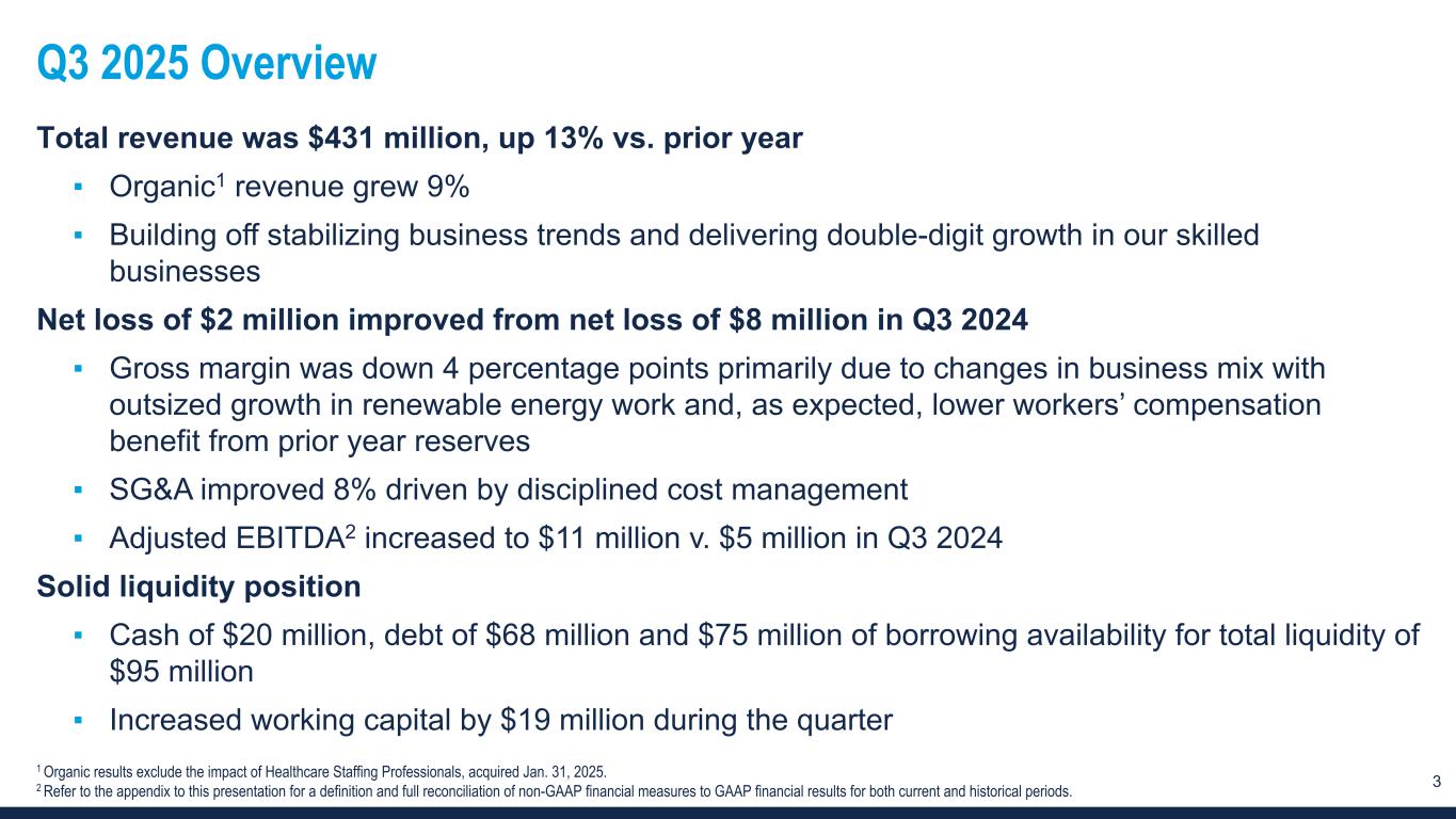 3 Q3 2025 Overview Total revenue was $431 million, up 13% vs. prior year ▪ Organic1 revenue grew 9% ▪ Building off stabilizing business trends and delivering double-digit growth in our skilled businesses Net loss of $2 million improved from net loss of $8 million in Q3 2024 ▪ Gross margin was down 4 percentage points primarily due to changes in business mix with outsized growth in renewable energy work and, as expected, lower workers’ compensation benefit from prior year reserves ▪ SG&A improved 8% driven by disciplined cost management ▪ Adjusted EBITDA2 increased to $11 million v. $5 million in Q3 2024 Solid liquidity position ▪ Cash of $20 million, debt of $68 million and $75 million of borrowing availability for total liquidity of $95 million ▪ Increased working capital by $19 million during the quarter 1 Organic results exclude the impact of Healthcare Staffing Professionals, acquired Jan. 31, 2025. 2 Refer to the appendix to this presentation for a definition and full reconciliation of non-GAAP financial measures to GAAP financial results for both current and historical periods.