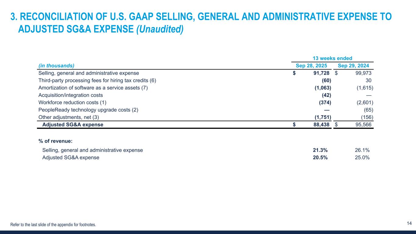 13 2. RECONCILIATION OF U.S. GAAP NET LOSS TO EBITDA AND ADJUSTED EBITDA (Unaudited) Refer to the last slide of the appendix for footnotes. 13 weeks ended (in thousands) Sep 28, 2025 Sep 29, 2024 Net loss $ (1,916) $ (7,635) Income tax expense 711 1,253 Interest and other (income) expense, net 1,059 (521) Depreciation and amortization (5) 7,345 6,967 EBITDA 7,199 64 Third-party processing fees for hiring tax credits (6) 60 (30) Amortization of software as a service assets (7) 1,063 1,615 Acquisition/integration costs 42 — Workforce reduction costs (1) 527 2,809 PeopleReady technology upgrade costs (2) — 65 Other adjustments, net (3) 1,751 156 Adjusted EBITDA $ 10,642 $ 4,679 Margin / % of revenue: Net loss (0.4) % (2.0) % Adjusted EBITDA 2.5 % 1.2 %