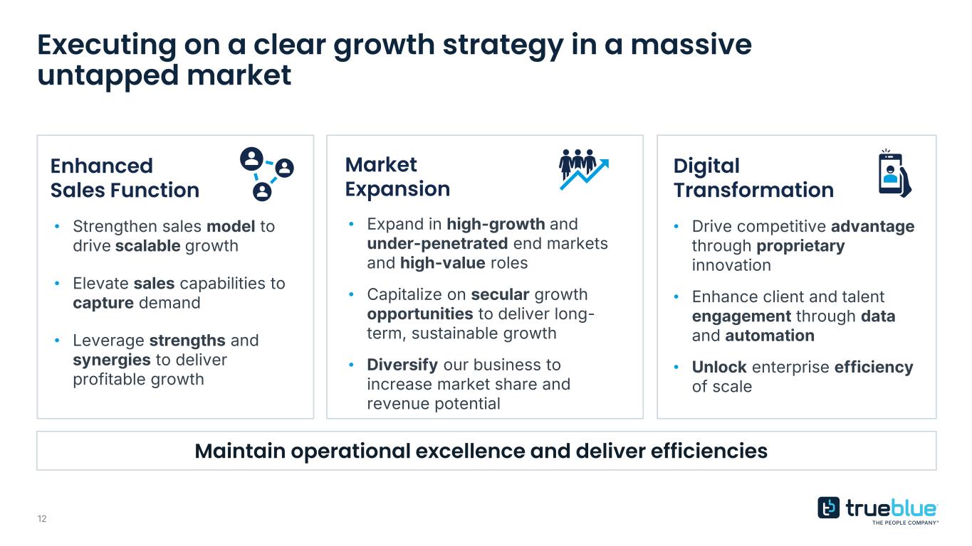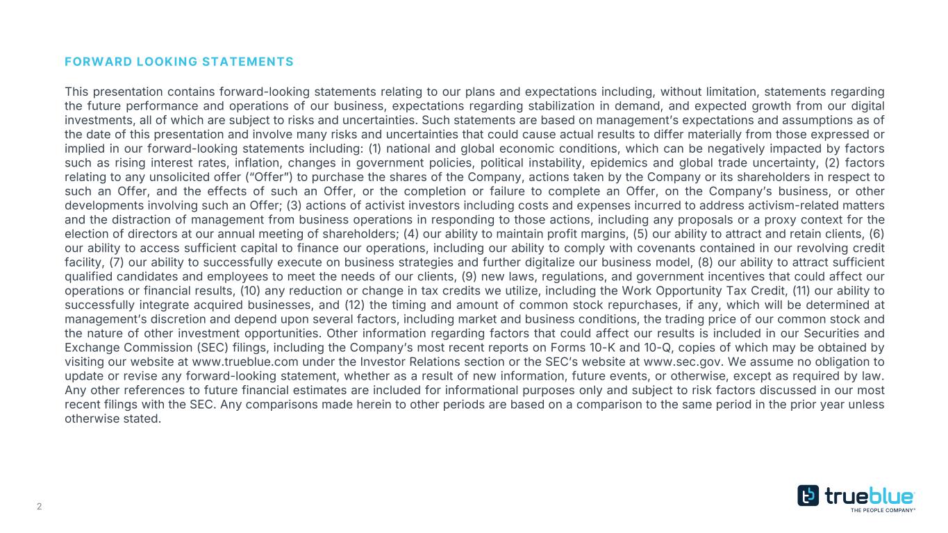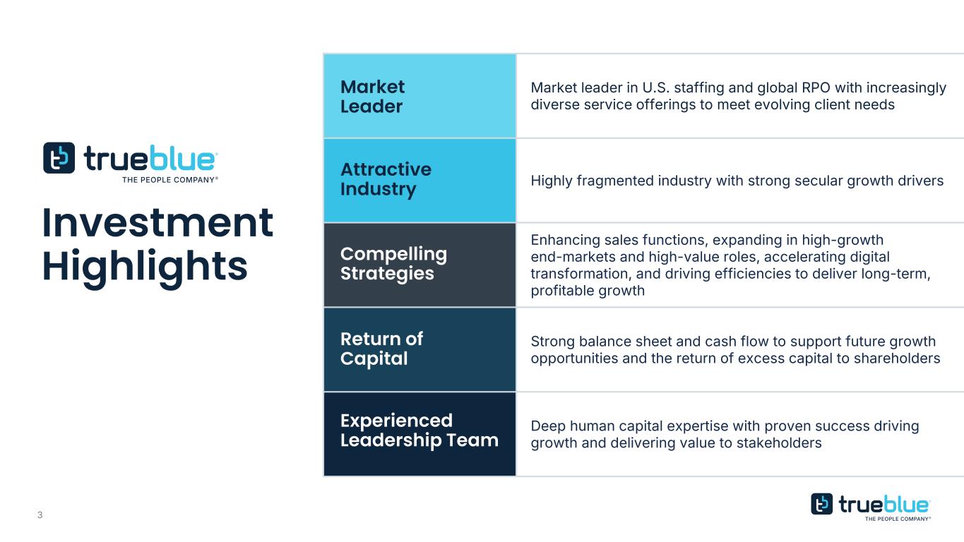2 FORWARD LOOKING STATEMENTS This presentation contains forward-looking statements relating to our plans and expectations including, without limitation, statements regarding the future performance and operations of our business, expectations regarding stabilization in demand, and expected growth from our digital investments, all of which are subject to risks and uncertainties. Such statements are based on management’s expectations and assumptions as of the date of this presentation and involve many risks and uncertainties that could cause actual results to differ materially from those expressed or implied in our forward-looking statements including: (1) national and global economic conditions, which can be negatively impacted by factors such as rising interest rates, inflation, changes in government policies, political instability, epidemics and global trade uncertainty, (2) factors relating to any unsolicited offer (“Offer”) to purchase the shares of the Company, actions taken by the Company or its shareholders in respect to such an Offer, and the effects of such an Offer, or the completion or failure to complete an Offer, on the Company’s business, or other developments involving such an Offer; (3) actions of activist investors including costs and expenses incurred to address activism-related matters and the distraction of management from business operations in responding to those actions, including any proposals or a proxy context for the election of directors at our annual meeting of shareholders; (4) our ability to maintain profit margins, (5) our ability to attract and retain clients, (6) our ability to access sufficient capital to finance our operations, including our ability to comply with covenants contained in our revolving credit facility, (7) our ability to successfully execute on business strategies and further digitalize our business model, (8) our ability to attract sufficient qualified candidates and employees to meet the needs of our clients, (9) new laws, regulations, and government incentives that could affect our operations or financial results, (10) any reduction or change in tax credits we utilize, including the Work Opportunity Tax Credit, (11) our ability to successfully integrate acquired businesses, and (12) the timing and amount of common stock repurchases, if any, which will be determined at management’s discretion and depend upon several factors, including market and business conditions, the trading price of our common stock and the nature of other investment opportunities. Other information regarding factors that could affect our results is included in our Securities and Exchange Commission (SEC) filings, including the Company’s most recent reports on Forms 10-K and 10-Q, copies of which may be obtained by visiting our website at www.trueblue.com under the Investor Relations section or the SEC’s website at www.sec.gov. We assume no obligation to update or revise any forward-looking statement, whether as a result of new information, future events, or otherwise, except as required by law. Any other references to future financial estimates are included for informational purposes only and subject to risk factors discussed in our most recent filings with the SEC. Any comparisons made herein to other periods are based on a comparison to the same period in the prior year unless otherwise stated.