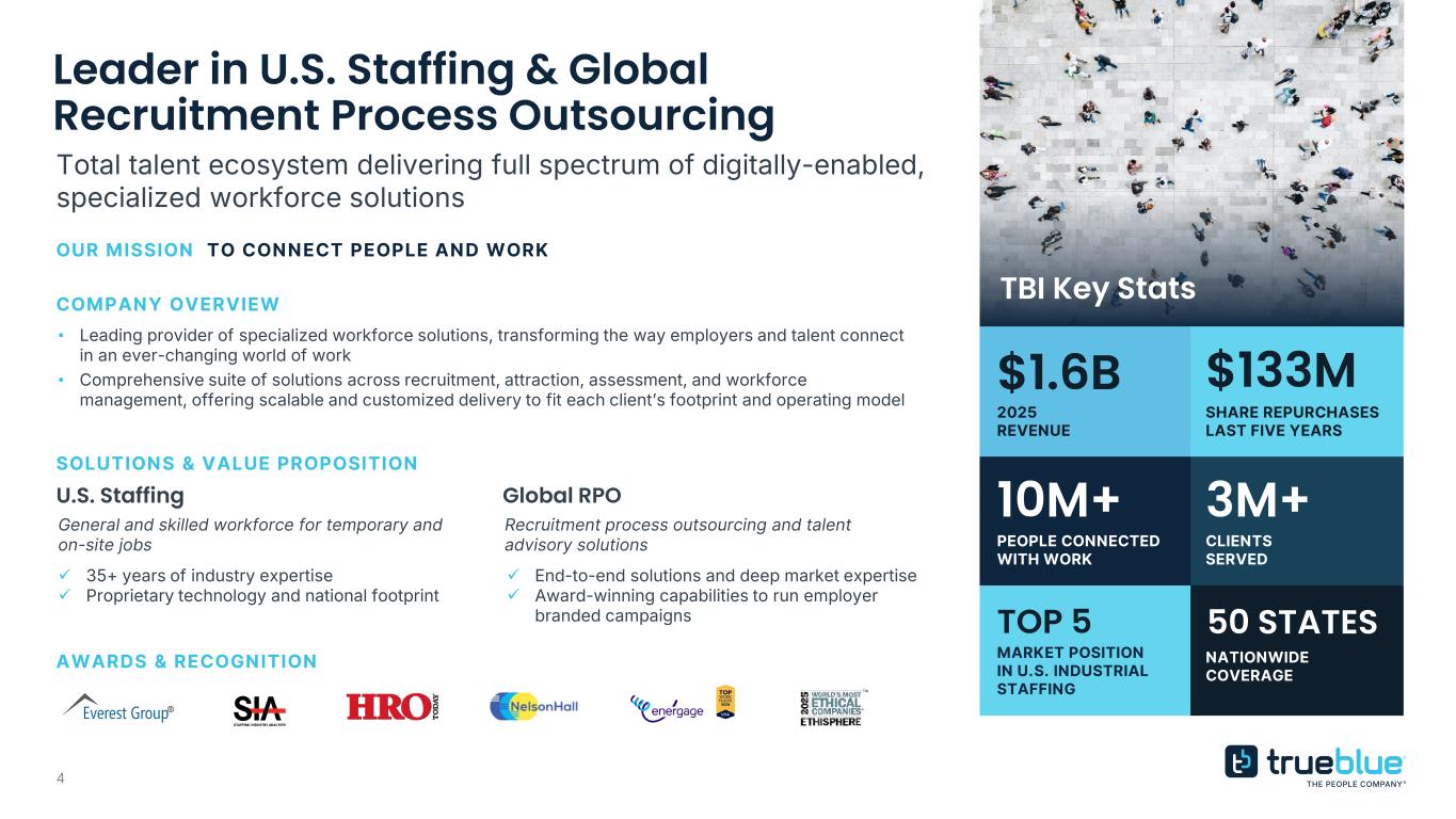 3 Investment Highlights Market leader in U.S. staffing and global RPO with increasingly diverse service offerings to meet evolving client needs Highly fragmented industry with strong secular growth drivers \ Enhancing sales functions, expanding in high-growth end-markets and high-value roles, accelerating digital transformation, and driving efficiencies to deliver long-term, profitable growth Strong balance sheet and cash flow to support future growth opportunities and the return of excess capital to shareholders Deep human capital expertise with proven success driving growth and delivering value to stakeholders Market Leader Attractive Industry Compelling Strategies Return of Capital Experienced Leadership Team