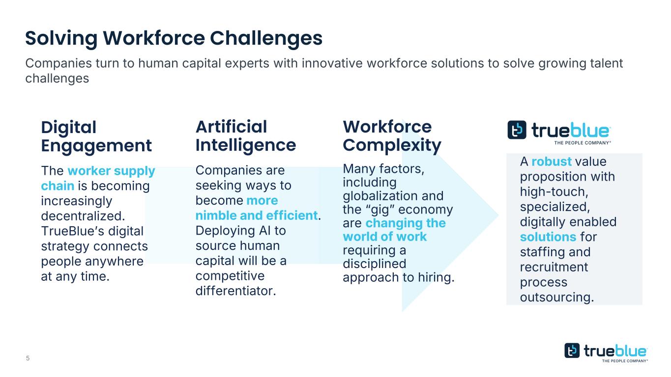 4 Leader in U.S. Staffing & Global Recruitment Process Outsourcing TBI Key Stats 2025 REVENUE SHARE REPURCHASES LAST FIVE YEARS PEOPLE CONNECTED WITH WORK CLIENTS SERVED MARKET POSITION IN U.S. INDUSTRIAL STAFFING NATIONWIDE COVERAGE $1.6B $133M 10M+ 3M+ TOP 5 50 STATES Total talent ecosystem delivering full spectrum of digitally-enabled, specialized workforce solutions OUR MISSION TO CONNECT PEOPLE AND WORK COMPANY OVERVIEW SOLUTIONS & VALUE PROPOSITION AWARDS & RECOGNITION • Leading provider of specialized workforce solutions, transforming the way employers and talent connect in an ever-changing world of work • Comprehensive suite of solutions across recruitment, attraction, assessment, and workforce management, offering scalable and customized delivery to fit each client’s footprint and operating model  35+ years of industry expertise  Proprietary technology and national footprint  End-to-end solutions and deep market expertise  Award-winning capabilities to run employer branded campaigns U.S. Staffing Global RPO General and skilled workforce for temporary and on-site jobs Recruitment process outsourcing and talent advisory solutions