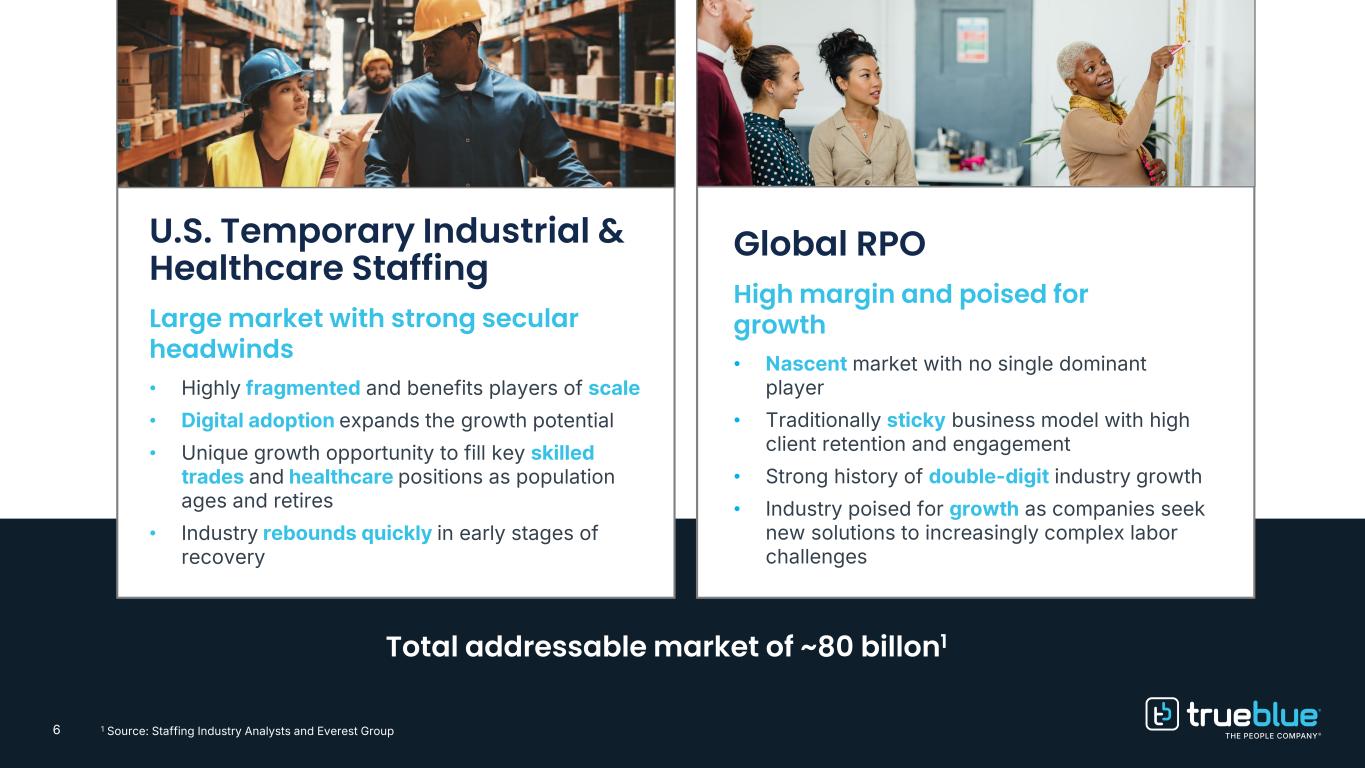 5 Solving Workforce Challenges A robust value proposition with high-touch, specialized, digitally enabled solutions for staffing and recruitment process outsourcing. Workforce Complexity Many factors, including globalization and the “gig” economy are changing the world of work requiring a disciplined approach to hiring. Artificial Intelligence Companies are seeking ways to becomemore nimble and efficient Deploying AI to source human capital will be a competitive differentiator. Digital Engagement The worker supply chain is becoming increasingly decentralized. TrueBlue’s digital strategy connects people anywhere at any time. Companies turn to human capital experts with innovative workforce solutions to solve growing talent challenges