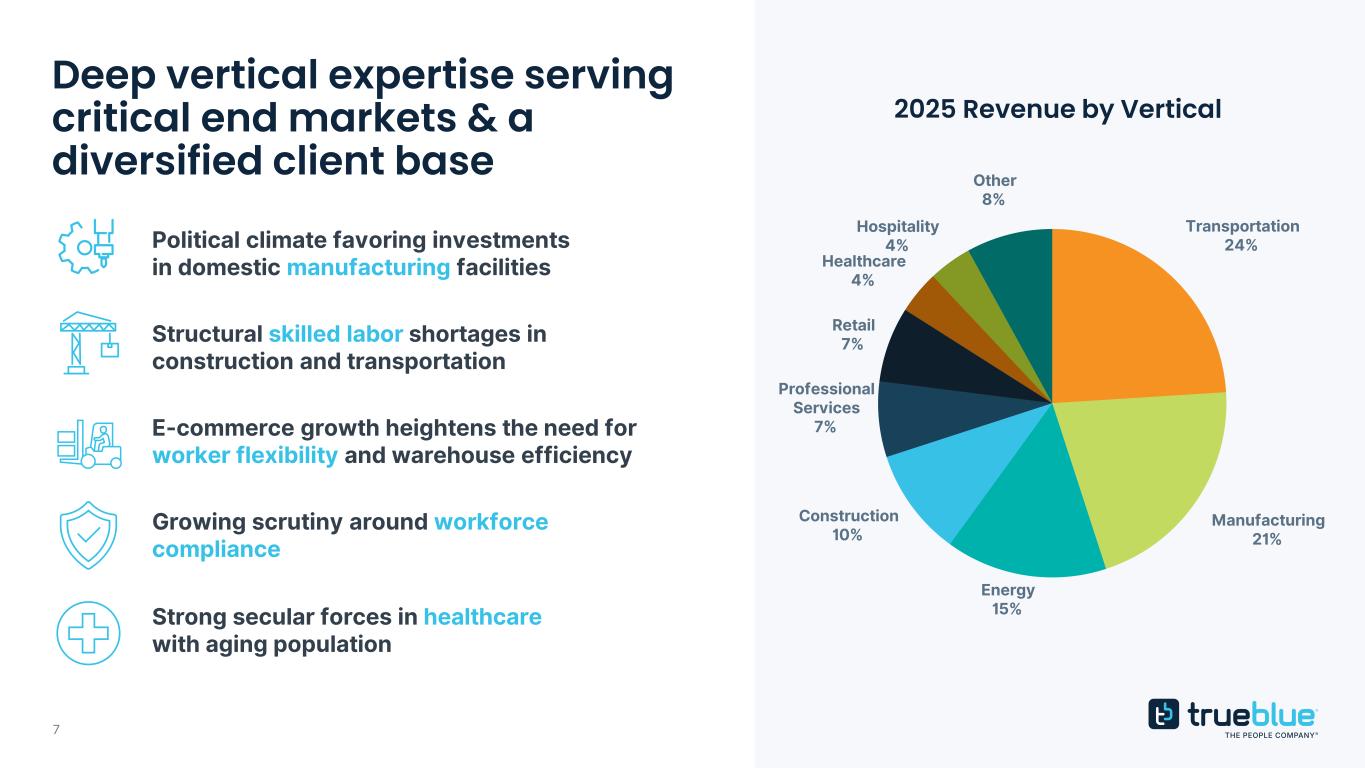 6 v U.S. Temporary Industrial & Healthcare Staffing Large market with strong secular headwinds • Highly fragmented and benefits players of scale • Digital adoption expands the growth potential • Unique growth opportunity to fill key skilled trades and healthcare positions as population ages and retires • Industry rebounds quickly in early stages of recovery Global RPO High margin and poised for growth • Nascent market with no single dominant player • Traditionally sticky business model with high client retention and engagement • Strong history of double-digit industry growth • Industry poised for growth as companies seek new solutions to increasingly complex labor challenges Total addressable market of ~80 billon1 1 Source: Staffing Industry Analysts and Everest Group