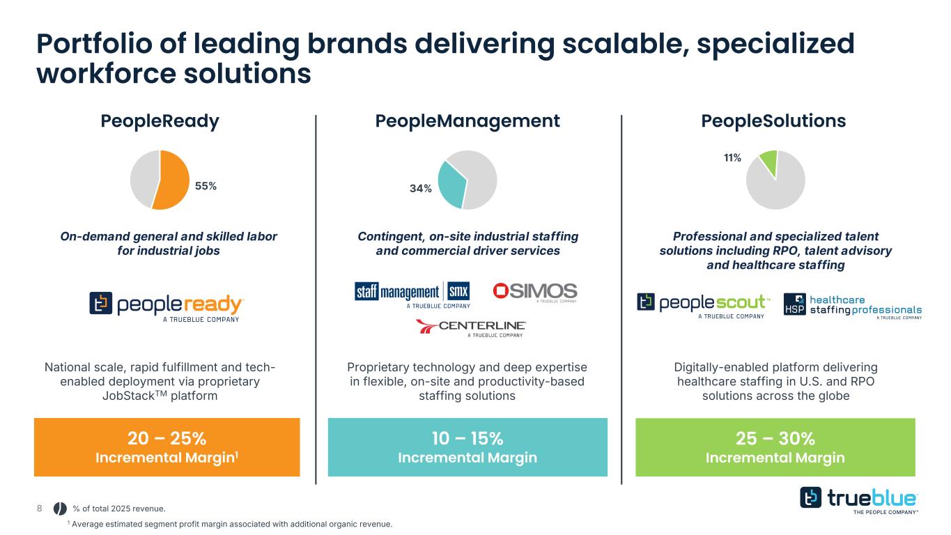 7 Deep vertical expertise serving critical end markets & a diversified client base Transportation 24% Manufacturing 21% Energy 15% Construction 10% Professional Services 7% Retail 7% Healthcare 4% Hospitality 4% Other 8% 2024 Revenue by Vertical 2025 Revenue by Vertical Political climate favoring investments in domestic manufacturing facilities Structural skilled labor shortages in construction and transportation E-commerce growth heightens the need for worker flexibility and warehouse efficiency Growing scrutiny around workforce compliance Strong secular forces in healthcare with aging population