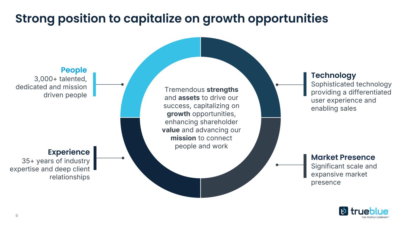 8 Portfolio of leading brands delivering scalable, specialized workforce solutions Contingent, on-site industrial staffing and commercial driver services On-demand general and skilled labor for industrial jobs Professional and specialized talent solutions including RPO, talent advisory and healthcare staffing 55% 34% 11% Proprietary technology and deep expertise in flexible, on-site and productivity-based staffing solutions National scale, rapid fulfillment and tech- enabled deployment via proprietary JobStackTM platform Digitally-enabled platform delivering healthcare staffing in U.S. and RPO solutions across the globe 20 – 25% Incremental Margin1 10 – 15% Incremental Margin 25 – 30% Incremental Margin PeopleReady PeopleManagement PeopleSolutions % of total 2025 revenue. 1 Average estimated segment profit margin associated with additional organic revenue.