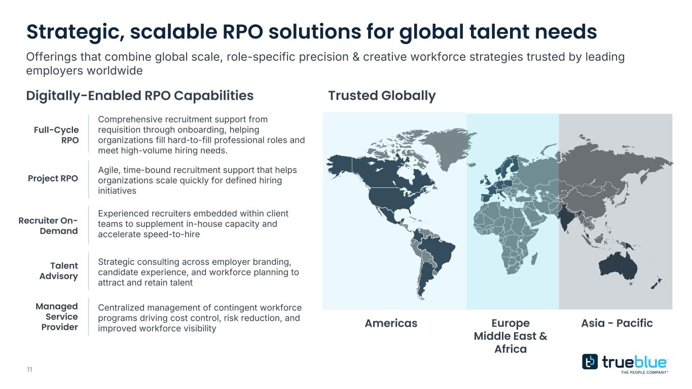 10 Omnichannel Workforce Delivery—connecting employers and talent across the U.S. Localized staffing support through branches across all 50 states, connecting businesses with talent in their communities. Branch-Based Embedded teams manage high-volume staffing directly at client locations, delivering operational efficiency and workforce continuity. Embedded On-Site Mobile teams deployed to support construction sites, facility ramp-ups, retail setups, and field-based operations across the U.S. Project & Field-Based App-powered, self-serve access to talent—enabling real-time hiring and flexible workforce management anytime, anywhere. Mobile Talent Management Driving differentiated value for employers Delivering access, choice and opportunity to talent  Specialized workforce solutions across contingent, skilled, and professional  Compliance focused operations to reduce risk and drive continuity at scale  Proprietary technology accelerates hiring and improves access to talent  Broad access to roles across industries, regions, and experience levels  Mobile platform gives talent control over when, where, and how they work  Upskilling and assessments unlock growth and support long-term retention Layered for coverage and built for growth — meeting employers and talent wherever they are and wherever they are going *Maps are illustrative