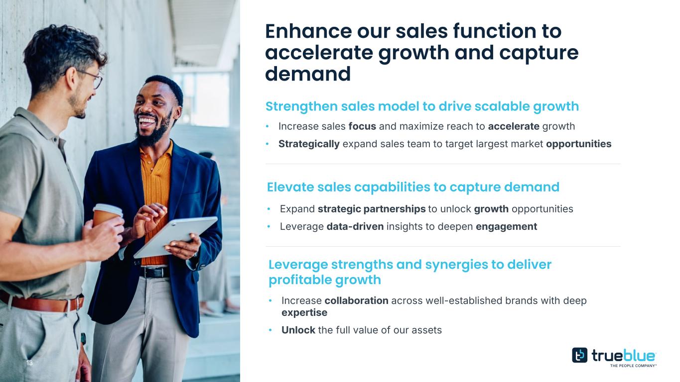 12 Executing on a clear growth strategy in a massive untapped market v Market Expansion • Expand in high-growth and under-penetrated end markets and high-value roles • Capitalize on secular growth opportunities to deliver long- term, sustainable growth • Diversify our business to increase market share and revenue potential v Enhanced Sales Function • Strengthen sales model to drive scalable growth • Elevate sales capabilities to capture demand • Leverage strengths and synergies to deliver profitable growth vMaintain operational excellence and deliver efficiencies v Digital Transformation • Drive competitive advantage through proprietary innovation • Enhance client and talent engagement through data and automation • Unlock enterprise efficiency of scale