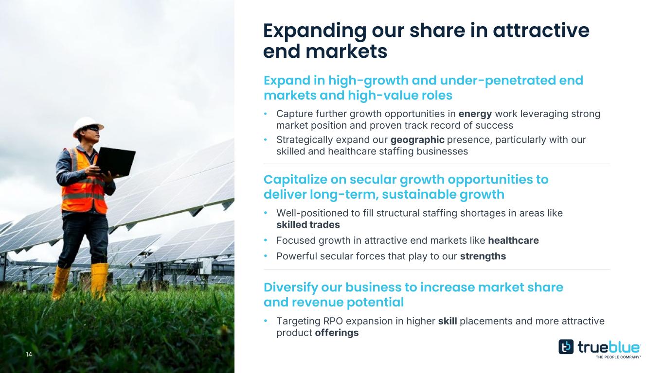13 Enhance our sales function to accelerate growth and capture demand Strengthen sales model to drive scalable growth Elevate sales capabilities to capture demand Leverage strengths and synergies to deliver profitable growth • Increase sales focus and maximize reach to accelerate growth • Strategically expand sales team to target largest market opportunities • Expand strategic partnerships to unlock growth opportunities • Leverage data-driven insights to deepen engagement • Increase collaboration across well-established brands with deep expertise • Unlock the full value of our assets