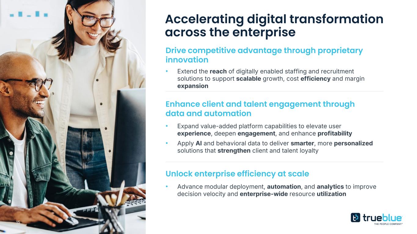 14 Expanding our share in attractive end markets Expand in high-growth and under-penetrated end markets and high-value roles • Capture further growth opportunities in energy work leveraging strong market position and proven track record of success • Strategically expand our geographic presence, particularly with our skilled and healthcare staffing businesses Capitalize on secular growth opportunities to deliver long-term, sustainable growth • Well-positioned to fill structural staffing shortages in areas like skilled trades • Focused growth in attractive end markets like healthcare • Powerful secular forces that play to our strengths Diversify our business to increase market share and revenue potential • Targeting RPO expansion in higher skill placements and more attractive product offerings