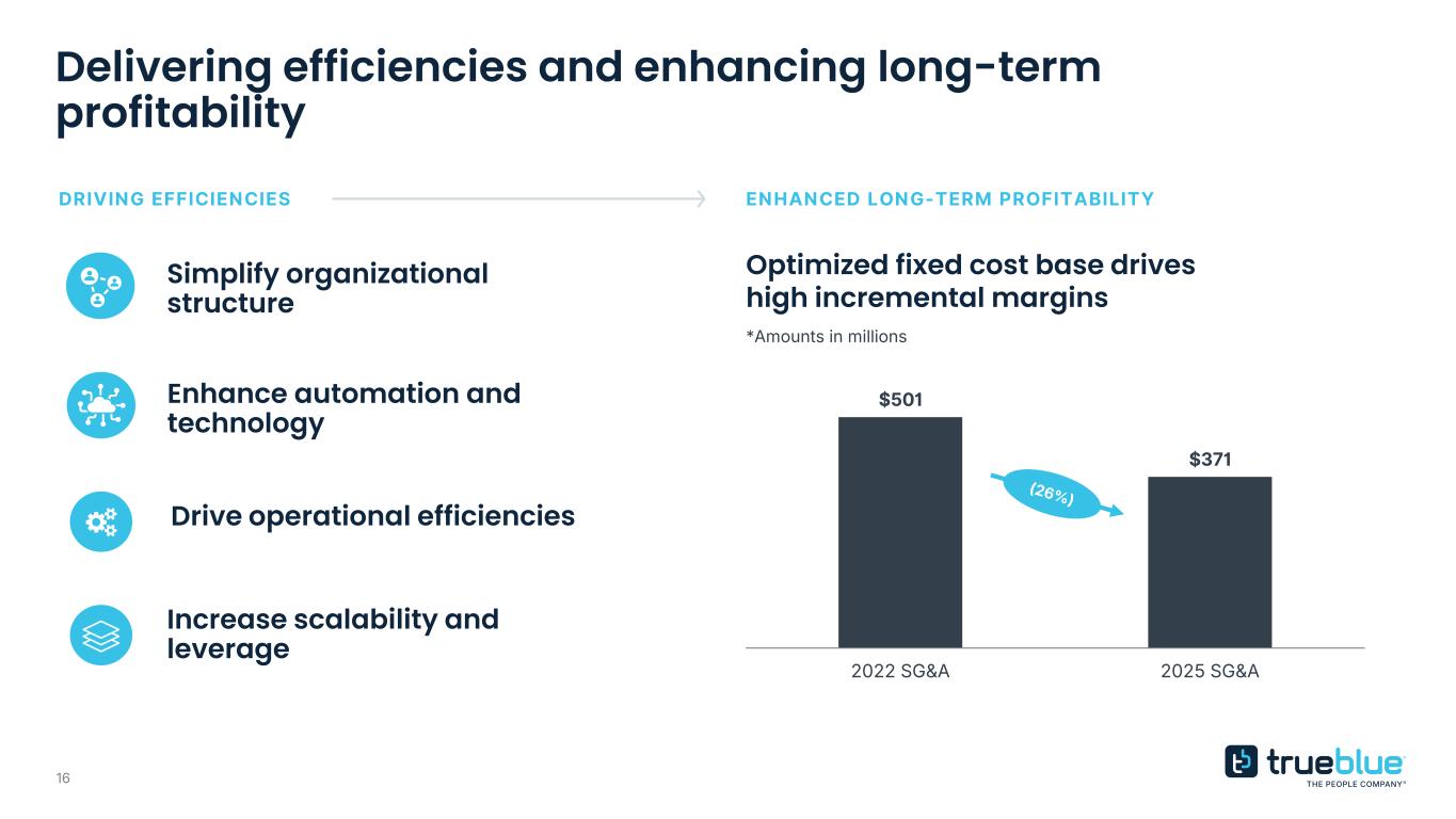 15 Accelerating digital transformation across the enterprise Drive competitive advantage through proprietary innovation • Extend the reach of digitally enabled staffing and recruitment solutions to support scalable growth, cost efficiency and margin expansion Enhance client and talent engagement through data and automation • Expand value-added platform capabilities to elevate user experience, deepen engagement, and enhance profitability • Apply AI and behavioral data to deliver smarter, more personalized solutions that strengthen client and talent loyalty Unlock enterprise efficiency at scale • Advance modular deployment, automation, and analytics to improve decision velocity and enterprise-wide resource utilization
