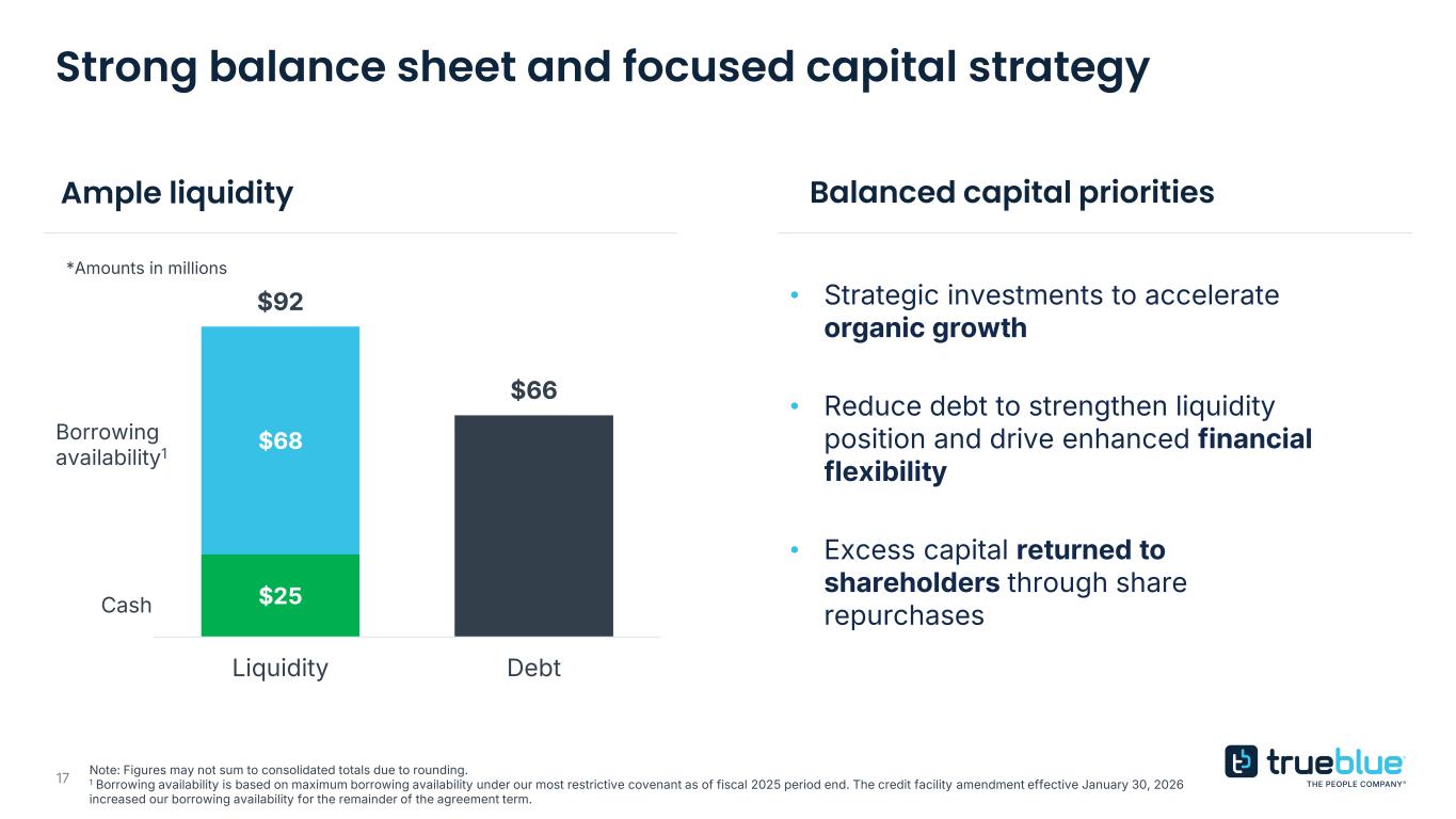 17 $25 $68 $92 $66 Liquidity Debt Strong balance sheet and focused capital strategy *Amounts in millions Ample liquidity Balanced capital priorities Note: Figures may not sum to consolidated totals due to rounding. 1 Borrowing availability is based on maximum borrowing availability under our most restrictive covenant as of fiscal 2025 period end. The credit facility amendment effective January 30, 2026 increased our borrowing availability for the remainder of the agreement term. • Strategic investments to accelerate organic growth • Reduce debt to strengthen liquidity position and drive enhanced financial flexibility • Excess capital returned to shareholders through share repurchases Borrowing availability1 Cash