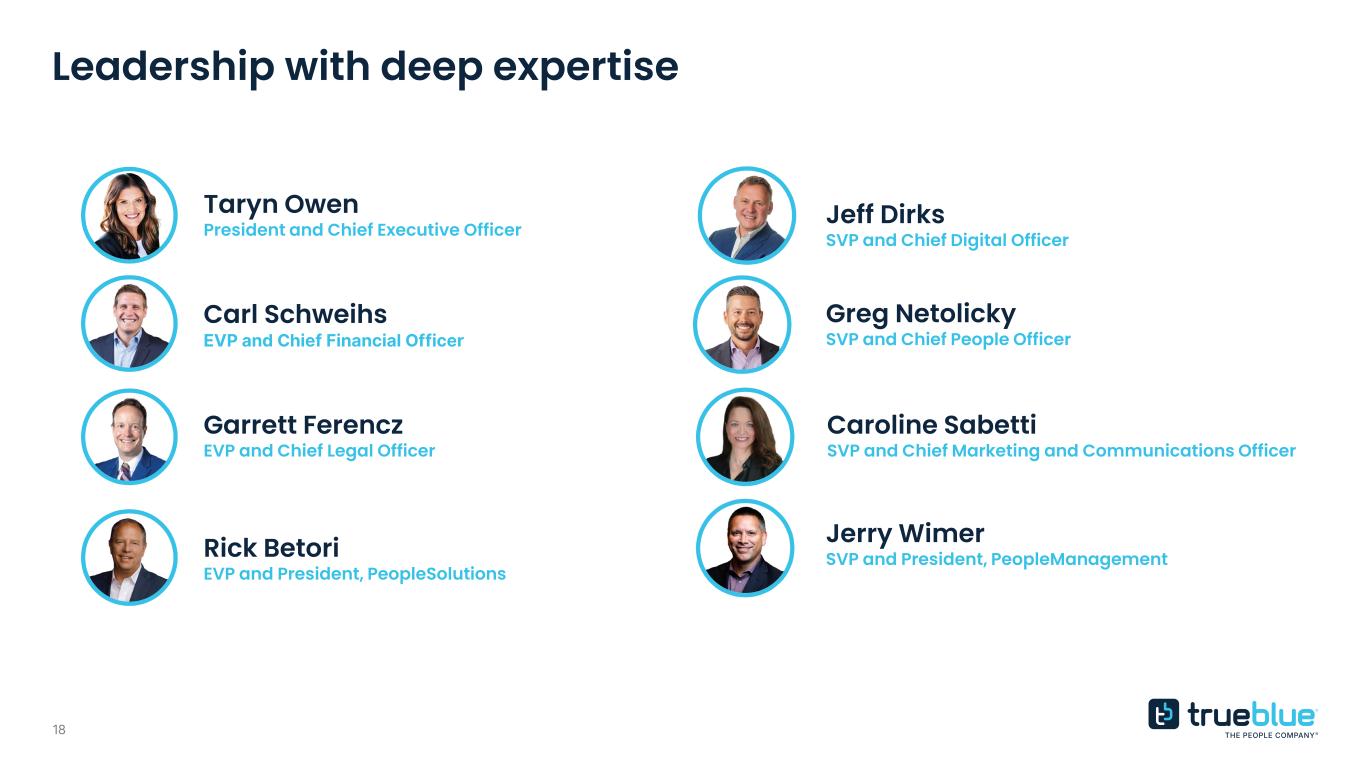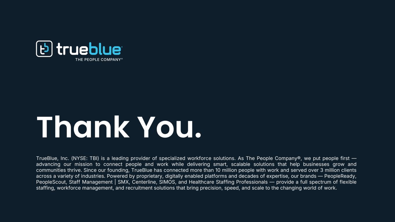 TrueBlue, Inc. (NYSE: TBI) is a leading provider of specialized workforce solutions. As The People Company®, we put people first — advancing our mission to connect people and work while delivering smart, scalable solutions that help businesses grow and communities thrive. Since our founding, TrueBlue has connected more than 10 million people with work and served over 3 million clients across a variety of industries. Powered by proprietary, digitally enabled platforms and decades of expertise, our brands — PeopleReady, PeopleScout, Staff Management | SMX, Centerline, SIMOS, and Healthcare Staffing Professionals — provide a full spectrum of flexible staffing, workforce management, and recruitment solutions that bring precision, speed, and scale to the changing world of work. Thank You.