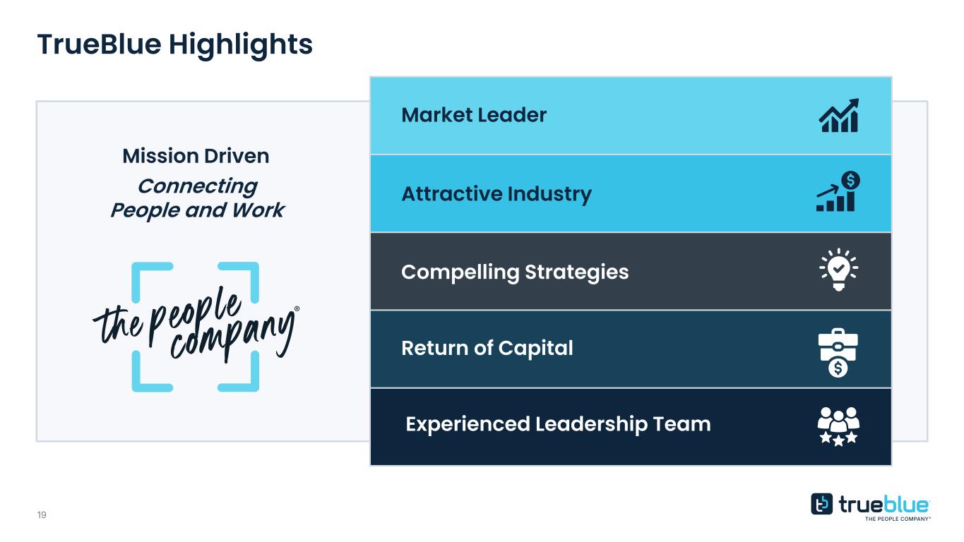 18 Leadership with deep expertise Taryn Owen President and Chief Executive Officer Carl Schweihs EVP and Chief Financial Officer Garrett Ferencz EVP and Chief Legal Officer Jerry Wimer SVP and President, PeopleManagement Jeff Dirks SVP and Chief Digital Officer Greg Netolicky SVP and Chief People Officer Caroline Sabetti SVP and Chief Marketing and Communications Officer Rick Betori EVP and President, PeopleSolutions