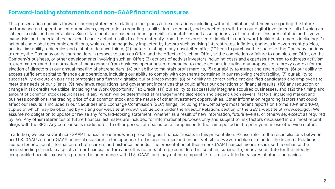 2 Forward-looking statements and non-GAAP financial measures This presentation contains forward-looking statements relating to our plans and expectations including, without limitation, statements regarding the future performance and operations of our business, expectations regarding stabilization in demand, and expected growth from our digital investments, all of which are subject to risks and uncertainties. Such statements are based on management’s expectations and assumptions as of the date of this presentation and involve many risks and uncertainties that could cause actual results to differ materially from those expressed or implied in our forward-looking statements including: (1) national and global economic conditions, which can be negatively impacted by factors such as rising interest rates, inflation, changes in government policies, political instability, epidemics and global trade uncertainty, (2) factors relating to any unsolicited offer (“Offer”) to purchase the shares of the Company, actions taken by the Company or its shareholders in respect to such an Offer, and the effects of such an Offer, or the completion or failure to complete an Offer, on the Company’s business, or other developments involving such an Offer; (3) actions of activist investors including costs and expenses incurred to address activism- related matters and the distraction of management from business operations in responding to those actions, including any proposals or a proxy context for the election of directors at our annual meeting of shareholders; (4) our ability to maintain profit margins, (5) our ability to attract and retain clients, (6) our ability to access sufficient capital to finance our operations, including our ability to comply with covenants contained in our revolving credit facility, (7) our ability to successfully execute on business strategies and further digitalize our business model, (8) our ability to attract sufficient qualified candidates and employees to meet the needs of our clients, (9) new laws, regulations, and government incentives that could affect our operations or financial results, (10) any reduction or change in tax credits we utilize, including the Work Opportunity Tax Credit, (11) our ability to successfully integrate acquired businesses, and (12) the timing and amount of common stock repurchases, if any, which will be determined at management’s discretion and depend upon several factors, including market and business conditions, the trading price of our common stock and the nature of other investment opportunities. Other information regarding factors that could affect our results is included in our Securities and Exchange Commission (SEC) filings, including the Company’s most recent reports on Forms 10-K and 10-Q, copies of which may be obtained by visiting our website at www.trueblue.com under the Investor Relations section or the SEC’s website at www.sec.gov. We assume no obligation to update or revise any forward-looking statement, whether as a result of new information, future events, or otherwise, except as required by law. Any other references to future financial estimates are included for informational purposes only and subject to risk factors discussed in our most recent filings with the SEC. Any comparisons made herein to other periods are based on a comparison to the same period in the prior year unless otherwise stated. In addition, we use several non-GAAP financial measures when presenting our financial results in this presentation. Please refer to the reconciliations between our U.S. GAAP and non-GAAP financial measures in the appendix to this presentation and on our website at www.trueblue.com under the Investor Relations section for additional information on both current and historical periods. The presentation of these non-GAAP financial measures is used to enhance the understanding of certain aspects of our financial performance. It is not meant to be considered in isolation, superior to, or as a substitute for the directly comparable financial measures prepared in accordance with U.S. GAAP, and may not be comparable to similarly titled measures of other companies.