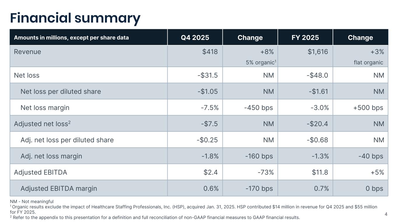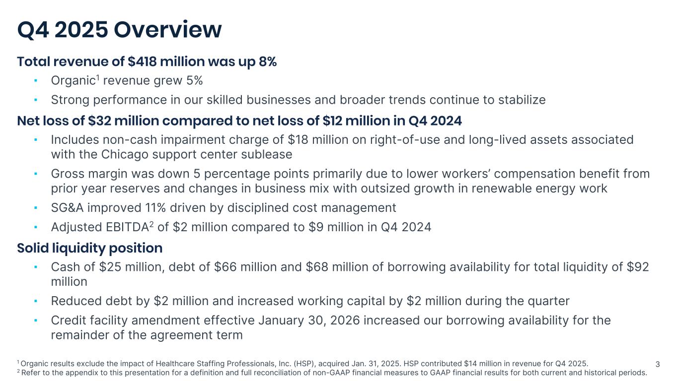 3 Q4 2025 Overview Total revenue of $418 million was up 8% ▪ Organic1 revenue grew 5% ▪ Strong performance in our skilled businesses and broader trends continue to stabilize Net loss of $32 million compared to net loss of $12 million in Q4 2024 ▪ Includes non-cash impairment charge of $18 million on right-of-use and long-lived assets associated with the Chicago support center sublease ▪ Gross margin was down 5 percentage points primarily due to lower workers’ compensation benefit from prior year reserves and changes in business mix with outsized growth in renewable energy work ▪ SG&A improved 11% driven by disciplined cost management ▪ Adjusted EBITDA2 of $2 million compared to $9 million in Q4 2024 Solid liquidity position ▪ Cash of $25 million, debt of $66 million and $68 million of borrowing availability for total liquidity of $92 million ▪ Reduced debt by $2 million and increased working capital by $2 million during the quarter ▪ Credit facility amendment effective January 30, 2026 increased our borrowing availability for the remainder of the agreement term 1 Organic results exclude the impact of Healthcare Staffing Professionals, Inc. (HSP), acquired Jan. 31, 2025. HSP contributed $14 million in revenue for Q4 2025. 2 Refer to the appendix to this presentation for a definition and full reconciliation of non-GAAP financial measures to GAAP financial results for both current and historical periods.