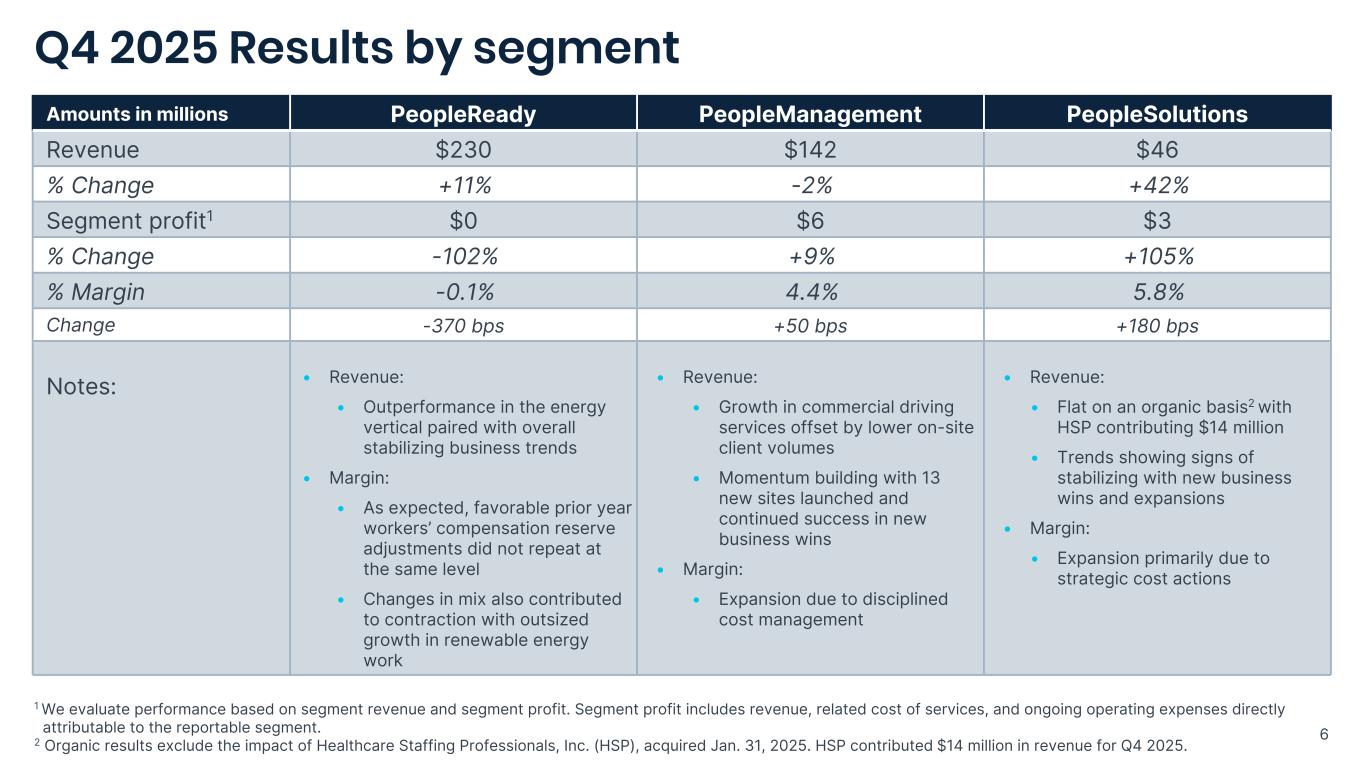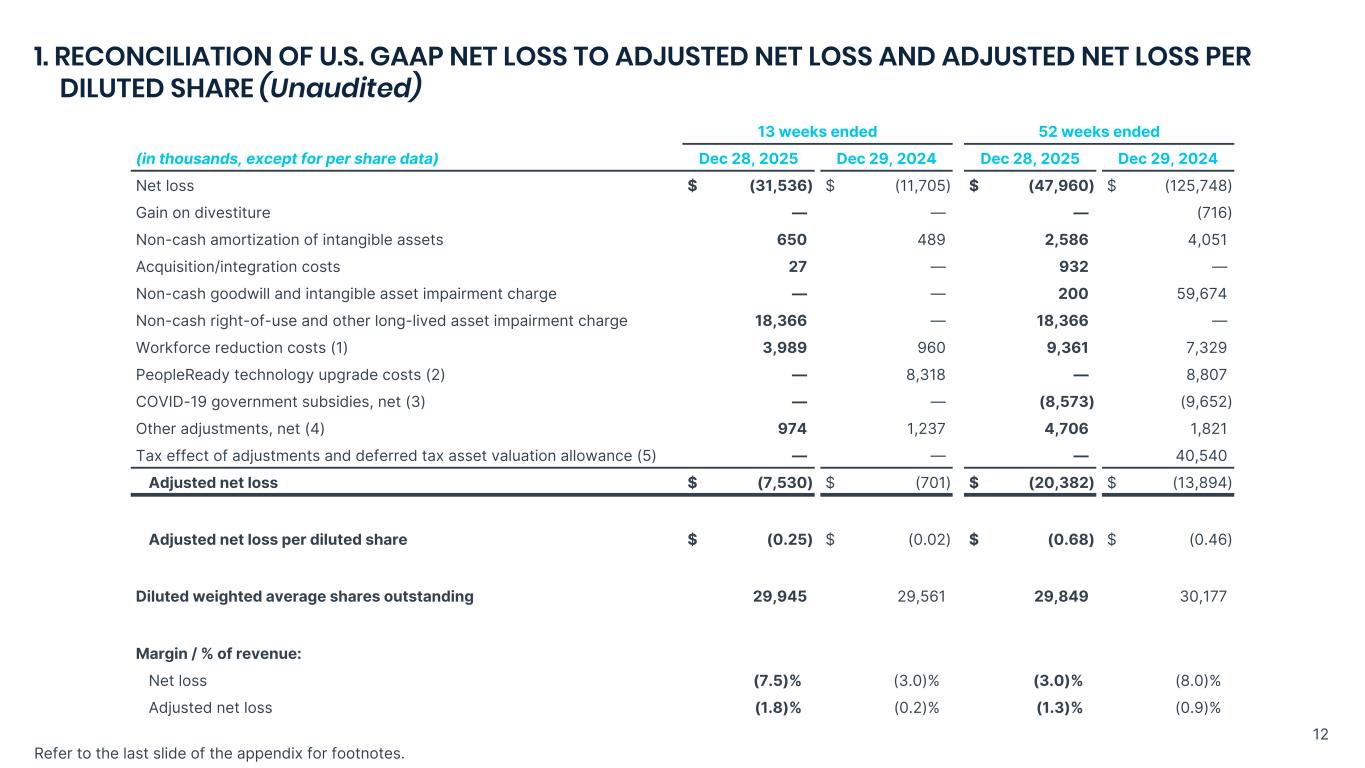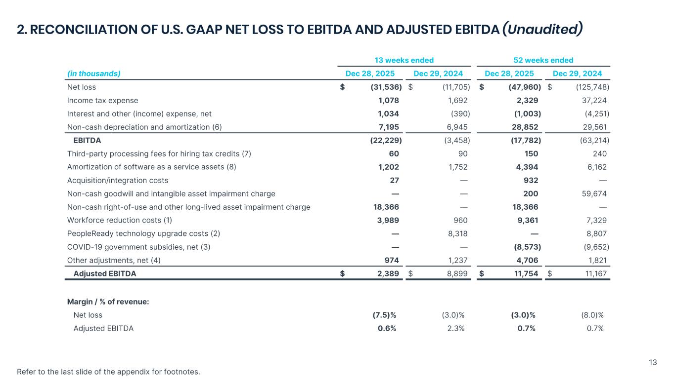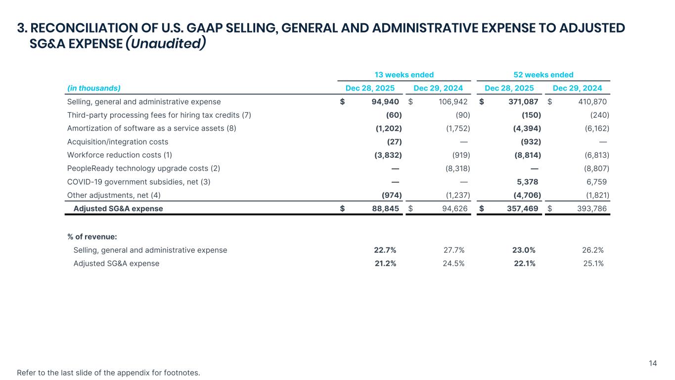 13 2. RECONCILIATION OF U.S. GAAP NET LOSS TO EBITDA AND ADJUSTED EBITDA (Unaudited) Refer to the last slide of the appendix for footnotes. 13 weeks ended 52 weeks ended (in thousands) Dec 28, 2025 Dec 29, 2024 Dec 28, 2025 Dec 29, 2024 Net loss $ (31,536) $ (11,705) $ (47,960) $ (125,748) Income tax expense 1,078 1,692 2,329 37,224 Interest and other (income) expense, net 1,034 (390) (1,003) (4,251) Non-cash depreciation and amortization (6) 7,195 6,945 28,852 29,561 EBITDA (22,229) (3,458) (17,782) (63,214) Third-party processing fees for hiring tax credits (7) 60 90 150 240 Amortization of software as a service assets (8) 1,202 1,752 4,394 6,162 Acquisition/integration costs 27 — 932 — Non-cash goodwill and intangible asset impairment charge — — 200 59,674 Non-cash right-of-use and other long-lived asset impairment charge 18,366 — 18,366 — Workforce reduction costs (1) 3,989 960 9,361 7,329 PeopleReady technology upgrade costs (2) — 8,318 — 8,807 COVID-19 government subsidies, net (3) — — (8,573) (9,652) Other adjustments, net (4) 974 1,237 4,706 1,821 Adjusted EBITDA $ 2,389 $ 8,899 $ 11,754 $ 11,167 Margin / % of revenue: Net loss (7.5) % (3.0) % (3.0) % (8.0) % Adjusted EBITDA 0.6 % 2.3 % 0.7 % 0.7 %