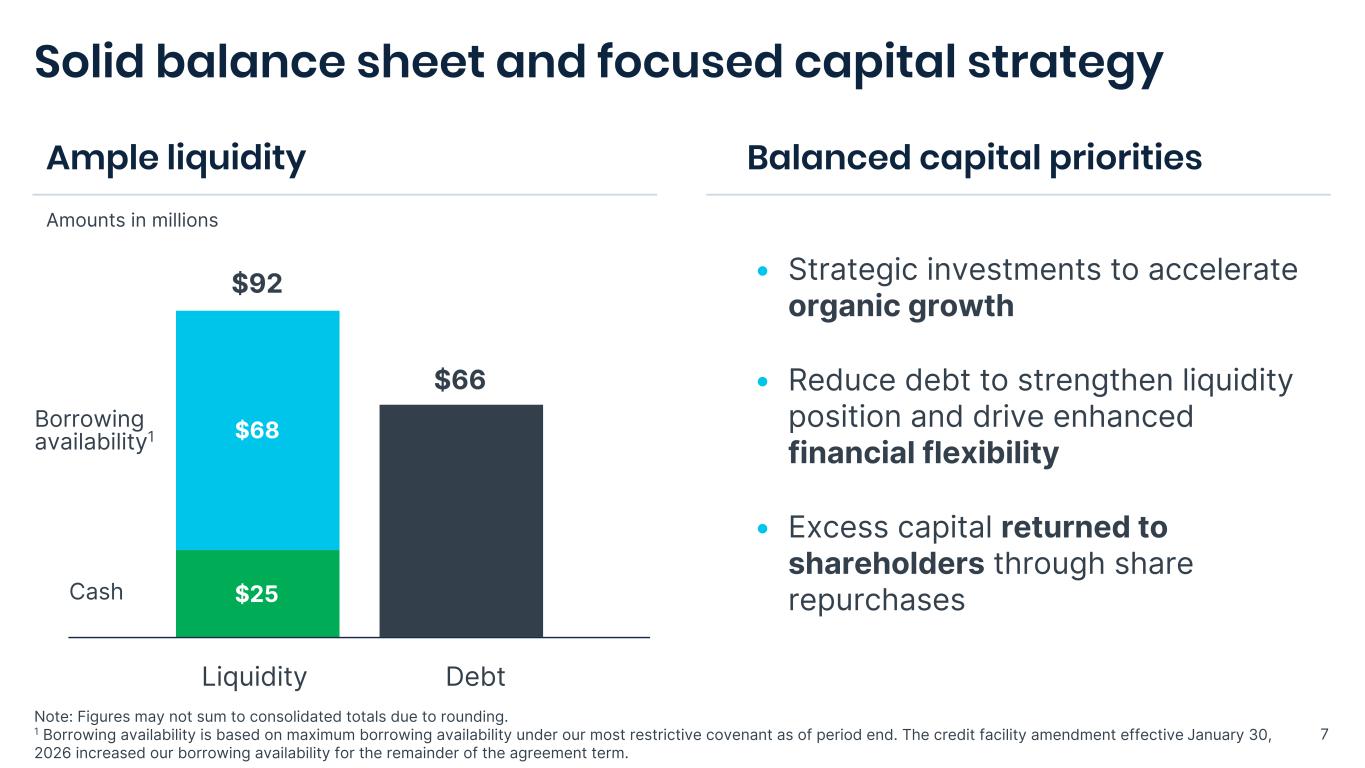 7 Solid balance sheet and focused capital strategy Amounts in millions $93 $66 $25 $68 Liquidity Debt Borrowing availability1 Cash Ample liquidity Balanced capital priorities • Strategic investments to accelerate organic growth • Reduce debt to strengthen liquidity position and drive enhanced financial flexibility • Excess capital returned to shareholders through share repurchases Note: Figures may not sum to consolidated totals due to rounding. 1 Borrowing availability is based on maximum borrowing availability under our most restrictive covenant as of period end. The credit facility amendment effective January 30, 2026 increased our borrowing availability for the remainder of the agreement term. 2