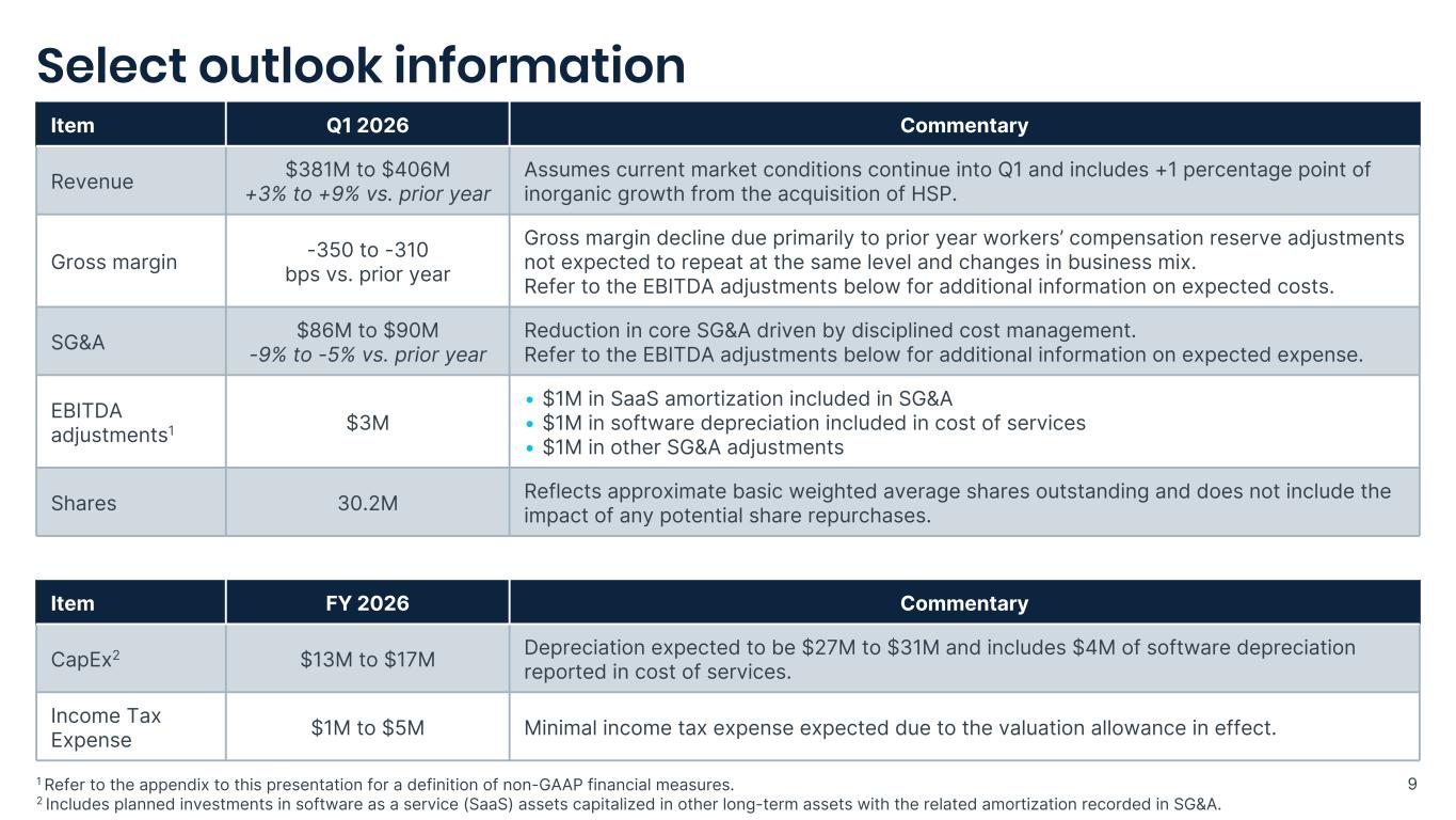 9 Select outlook information Item Q1 2026 Commentary Revenue $381M to $406M +3% to +9% vs. prior year Assumes current market conditions continue into Q1 and includes +1 percentage point of inorganic growth from the acquisition of HSP. Gross margin -350 to -310 bps vs. prior year Gross margin decline due primarily to prior year workers’ compensation reserve adjustments not expected to repeat at the same level and changes in business mix. Refer to the EBITDA adjustments below for additional information on expected costs. SG&A $86M to $90M -9% to -5% vs. prior year Reduction in core SG&A driven by disciplined cost management. Refer to the EBITDA adjustments below for additional information on expected expense. EBITDA adjustments1 $3M • $1M in SaaS amortization included in SG&A • $1M in software depreciation included in cost of services • $1M in other SG&A adjustments Shares 30.2M Reflects approximate basic weighted average shares outstanding and does not include the impact of any potential share repurchases. Item FY 2026 Commentary CapEx2 $13M to $17M Depreciation expected to be $27M to $31M and includes $4M of software depreciation reported in cost of services. Income Tax Expense $1M to $5M Minimal income tax expense expected due to the valuation allowance in effect. 1 Refer to the appendix to this presentation for a definition of non-GAAP financial measures. 2 Includes planned investments in software as a service (SaaS) assets capitalized in other long-term assets with the related amortization recorded in SG&A.