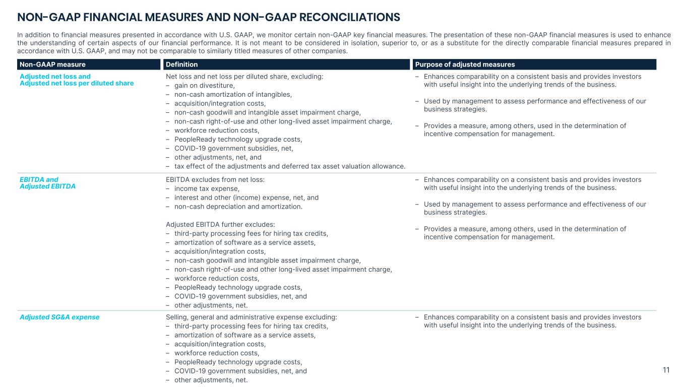 11 NON-GAAP FINANCIAL MEASURES AND NON-GAAP RECONCILIATIONS In addition to financial measures presented in accordance with U.S. GAAP, we monitor certain non-GAAP key financial measures. The presentation of these non-GAAP financial measures is used to enhance the understanding of certain aspects of our financial performance. It is not meant to be considered in isolation, superior to, or as a substitute for the directly comparable financial measures prepared in accordance with U.S. GAAP, and may not be comparable to similarly titled measures of other companies. Non-GAAP measure Definition Purpose of adjusted measures Adjusted net loss and Adjusted net loss per diluted share Net loss and net loss per diluted share, excluding: – gain on divestiture, – non-cash amortization of intangibles, – acquisition/integration costs, – non-cash goodwill and intangible asset impairment charge, – non-cash right-of-use and other long-lived asset impairment charge, – workforce reduction costs, – PeopleReady technology upgrade costs, – COVID-19 government subsidies, net, – other adjustments, net, and – tax effect of the adjustments and deferred tax asset valuation allowance. – Enhances comparability on a consistent basis and provides investors with useful insight into the underlying trends of the business. – Used by management to assess performance and effectiveness of our business strategies. – Provides a measure, among others, used in the determination of incentive compensation for management. EBITDA and Adjusted EBITDA EBITDA excludes from net loss: – income tax expense, – interest and other (income) expense, net, and – non-cash depreciation and amortization. Adjusted EBITDA further excludes: – third-party processing fees for hiring tax credits, – amortization of software as a service assets, – acquisition/integration costs, – non-cash goodwill and intangible asset impairment charge, – non-cash right-of-use and other long-lived asset impairment charge, – workforce reduction costs, – PeopleReady technology upgrade costs, – COVID-19 government subsidies, net, and – other adjustments, net. – Enhances comparability on a consistent basis and provides investors with useful insight into the underlying trends of the business. – Used by management to assess performance and effectiveness of our business strategies. – Provides a measure, among others, used in the determination of incentive compensation for management. Adjusted SG&A expense Selling, general and administrative expense excluding: – third-party processing fees for hiring tax credits, – amortization of software as a service assets, – acquisition/integration costs, – workforce reduction costs, – PeopleReady technology upgrade costs, – COVID-19 government subsidies, net, and – other adjustments, net. – Enhances comparability on a consistent basis and provides investors with useful insight into the underlying trends of the business.