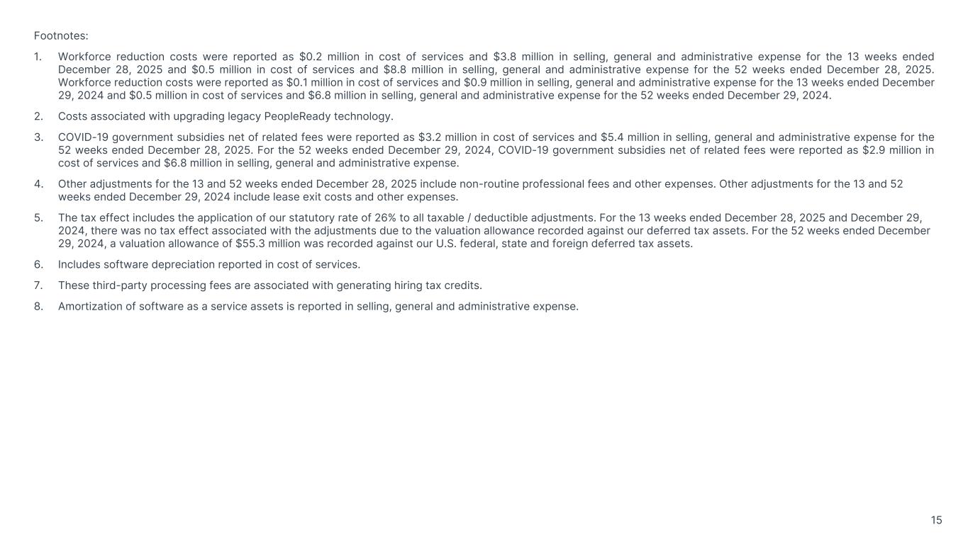 15 Footnotes: 1. Workforce reduction costs were reported as $0.2 million in cost of services and $3.8 million in selling, general and administrative expense for the 13 weeks ended December 28, 2025 and $0.5 million in cost of services and $8.8 million in selling, general and administrative expense for the 52 weeks ended December 28, 2025. Workforce reduction costs were reported as $0.1 million in cost of services and $0.9 million in selling, general and administrative expense for the 13 weeks ended December 29, 2024 and $0.5 million in cost of services and $6.8 million in selling, general and administrative expense for the 52 weeks ended December 29, 2024. 2. Costs associated with upgrading legacy PeopleReady technology. 3. COVID-19 government subsidies net of related fees were reported as $3.2 million in cost of services and $5.4 million in selling, general and administrative expense for the 52 weeks ended December 28, 2025. For the 52 weeks ended December 29, 2024, COVID-19 government subsidies net of related fees were reported as $2.9 million in cost of services and $6.8 million in selling, general and administrative expense. 4. Other adjustments for the 13 and 52 weeks ended December 28, 2025 include non-routine professional fees and other expenses. Other adjustments for the 13 and 52 weeks ended December 29, 2024 include lease exit costs and other expenses. 5. The tax effect includes the application of our statutory rate of 26% to all taxable / deductible adjustments. For the 13 weeks ended December 28, 2025 and December 29, 2024, there was no tax effect associated with the adjustments due to the valuation allowance recorded against our deferred tax assets. For the 52 weeks ended December 29, 2024, a valuation allowance of $55.3 million was recorded against our U.S. federal, state and foreign deferred tax assets. 6. Includes software depreciation reported in cost of services. 7. These third-party processing fees are associated with generating hiring tax credits. 8. Amortization of software as a service assets is reported in selling, general and administrative expense.